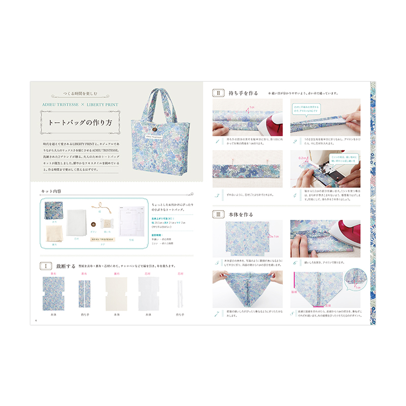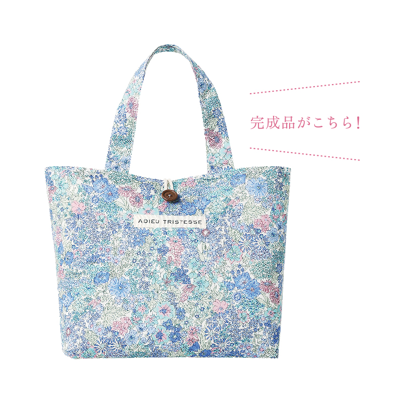 英国リバティ社の創業140周年を記念して、リバティプリントのトートバッグが作れるハンドメイドキットの登場です。ノスタルジックな雰囲気が魅力のブランド「ADIEU TRISTESSE(アデュートリステス)」とのコラボが実現!人気柄「マーガレットアニー」のカラーリングをアデュートリステスが担当しました。ブルーをベースに、一部ラメプリントが施されているタナローン生地は本誌限定デザイン。タナローン生地を含むバッグがひとつ作れるキットと型紙、わかりやすい作り方BOOKをセットでお届け。