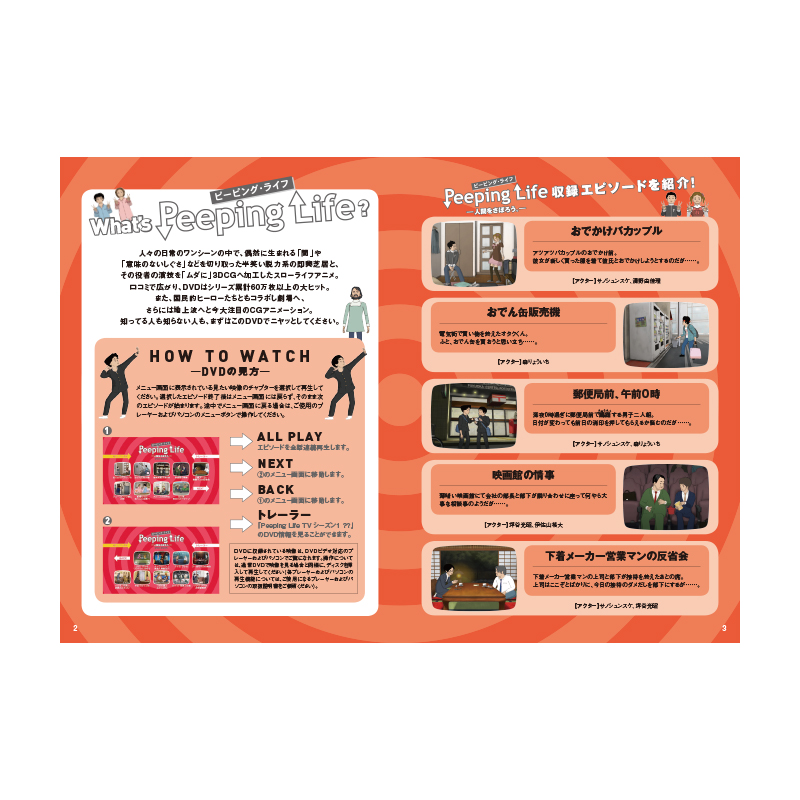 2015年10月より地上波放送も始まった、『人間をさぼろう。』というキャッチフレーズと、「ムダに」3DCG加工したシュールすぎる即興芝居がネットで話題の、究極にゆるいCGアニメーション『Peeping Life』の傑作選DVDが登場!意味のないしぐさを切り取ったショートアドリブストーリーの傑作選をたっぷり詰め込みました!
