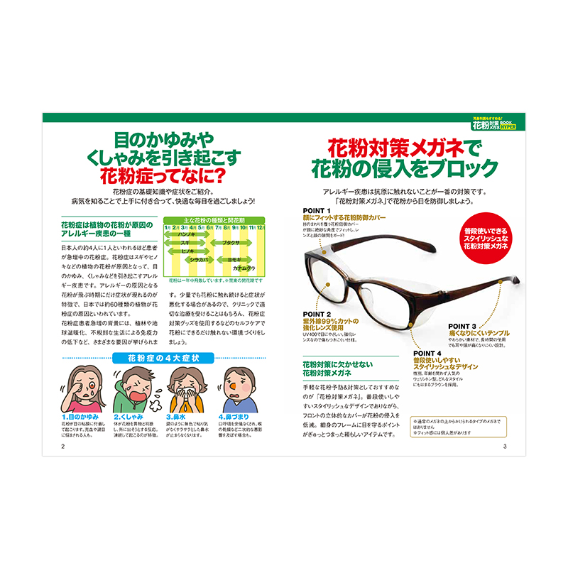 つらい花粉症の季節、眼球への花粉の侵入を防ぐ「花粉対策メガネ」付きBOOKです。メガネの上下についた透明のカバーが、フレームと顔の隙間をなくし、徹底的に花粉の侵入を防ぐことができます。形はスタイリッシュなウェリントン型で、男女兼用はもちろん、おしゃれにも普段使いにもピッタリ。また、柔らかめのテンプルを採用し、長時間の使用でも耳が痛くなりづらい程よいフィット感を実現。花粉対策の情報満載の花粉から身を守るセルフケアBOOK付き。