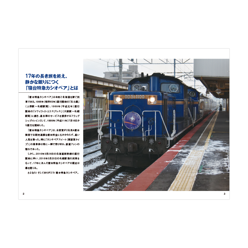 「寝台特急カシオペア」は上野〜札幌間を往復している寝台列車ですが、2016年3月の北海道新幹線開業に合わせ廃止となります。これで東京と札幌を結ぶ寝台列車はすべて無くなることになります。廃止が発表された2015年の9月からカシオペアの乗車チケットは一気にプラチナ化し、発売と同時に完売するほどの人気です。本誌は「寝台特急カシオペア」の上野〜札幌間の全ルートを紹介するとともに、車内・車外映像をすべて撮りおろしでご紹介。ドローンを駆使した誰も見たことのない空撮映像も収録しました。