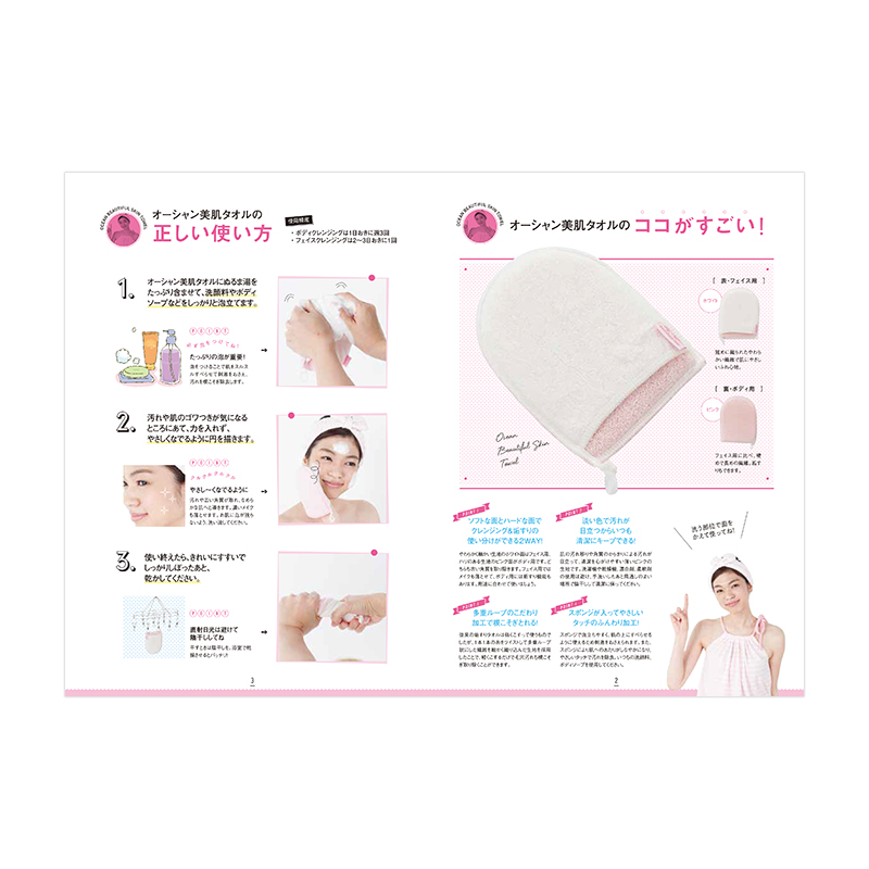 垢すり後のようなツルすべ肌が手に入る美肌タオル付きブックの登場です。顔のくすみや、二の腕のざらざら、ひじ・ひざのかさかさなど、全身これ一つですっきりすべすべ美肌に!ヒミツは、ループ状に織られた特殊な構造。繊維が毛穴の奥に入り込んだ垢まで届いてしっかり掻き出します。使い方は入浴時にやさしくマッサージするだけ。ごしごしこする必要はありません。ご自宅で簡単&本格美肌ケアを体験してください。