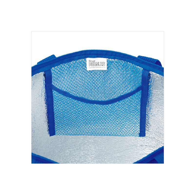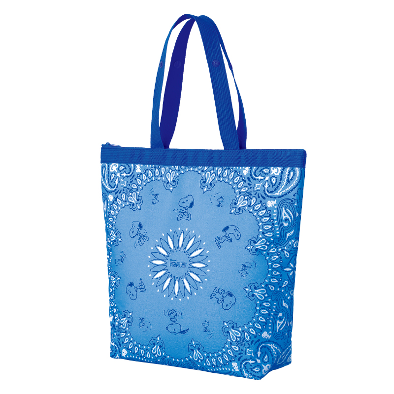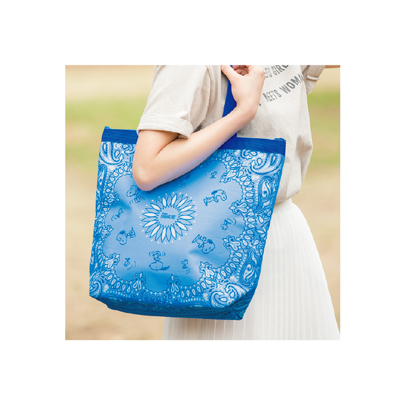 スヌーピーとウッドストックがペイズリー柄の中に見え隠れ!ブルーが爽やかでおしゃれなバンダナ風のデザインは、この保冷バッグだけのオリジナル。ワインボトルもラクラク入るビッグサイズのトート型保冷バッグは、くるくるとコンパクトに丸めることができて、持ち運びにもとっても便利♪ 内側には保冷剤を入れられる内ポケット付きで機能性もバツグンです!