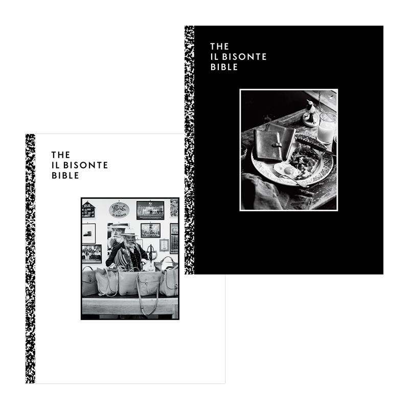 そして!イル ビゾンテの真骨頂はなんといっても“質の良いヌメ革”。今回も、ブランドロゴが刻印されたイタリア製の本革タグが付いています。まるで写真集のような2冊のビジュアルブックでも、ヌメ革にスポットライトをあてました。