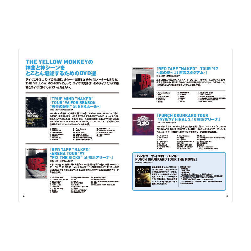 この最(再)集結の機会に改めて、ザ・イエロー・モンキーのライヴの衝撃を少しでも多くの人に伝えたいと、ベスト・オブ・ベストのライヴの数々と、インタビュー、ライヴMC、ロードムービーなどの印象的なドキュメント映像を厳選して収録しました。