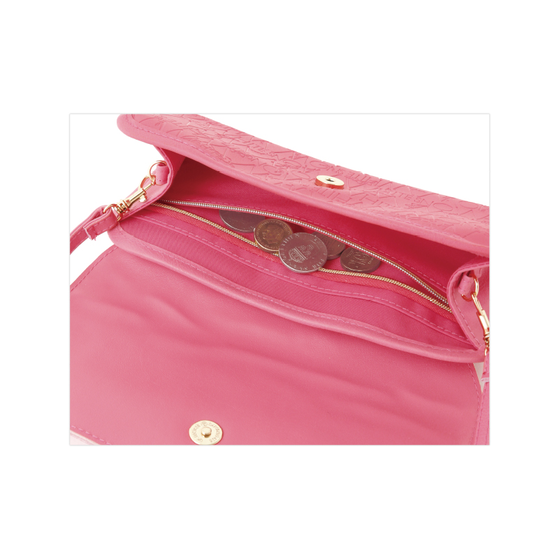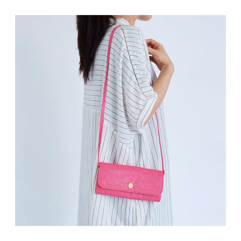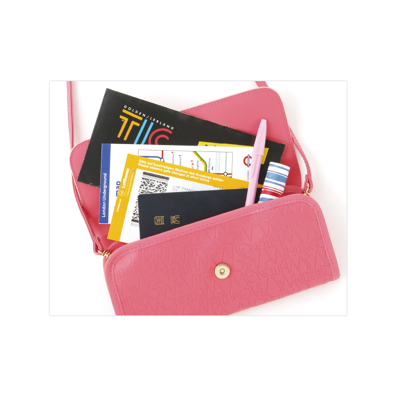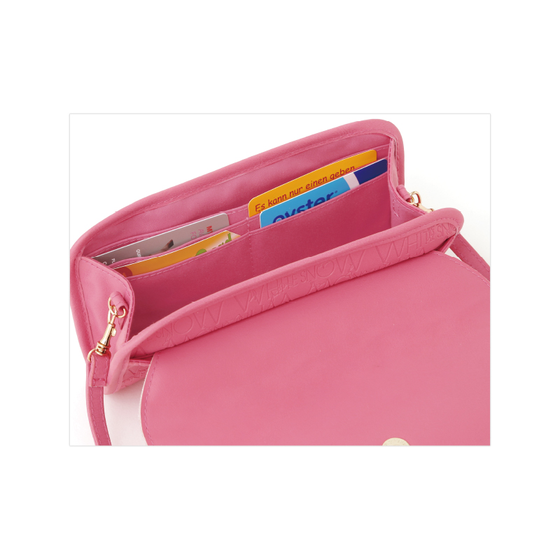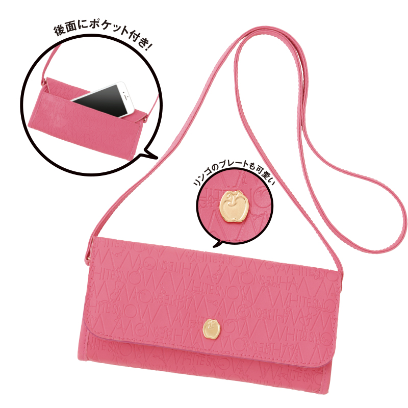 ディズニープリンセスの「白雪姫」モチーフのお財布バッグができました。ロゴとリボンをあしらい、高級感あふれるデザインに。リンゴモチーフのプレートもポイントになっています。ショルダーストラップは取り外しが可能で、お財布としてもバッグとしても使用できる2wayタイプ。最新グッズカタログなどを掲載したミニBOOKが付いています。