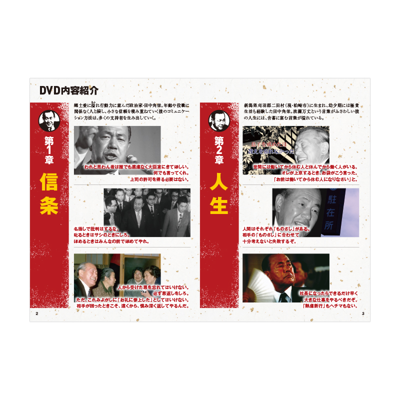 昭和を駆け抜けた偉人、元総理大臣・田中角栄。日本列島改造、日中国交正常化など壮大な仕事を成し遂げた偉大な政治家であり、その人間的魅力とスケール感は日本の政治において稀有な存在だといえます。そんな田中角栄の言葉には学ぶべきところが数多くあり、本DVDはその映像と名言をまとめたDVDです。周恩来、毛沢東との貴重な会談シーンも収録。