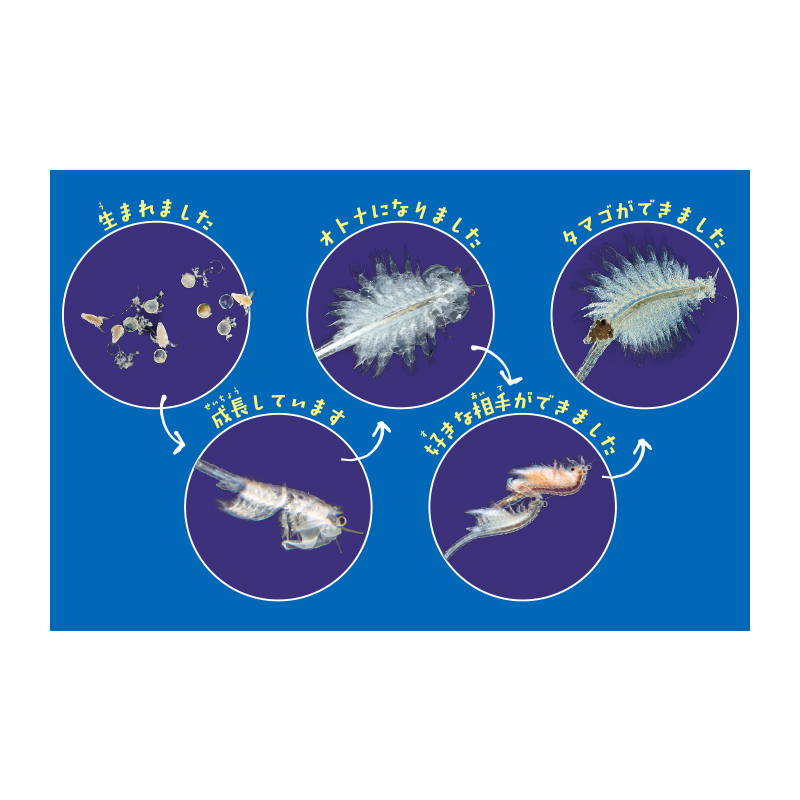 シーモンキーは「アルテミナ サリーナ(Artemia salina)」という鰓脚類(さいきゃくるい)の仲間です。水そうにタマゴを入れると1〜3日ほどでフ化し成長を始めます。飼育が簡単なことと成長が早いことから、子どもたちの自由研究のテーマとしても高い人気を誇ります。昭和40年代にも大ブームを巻き起こし、当時飼育していた世代にも懐かしい一品です。