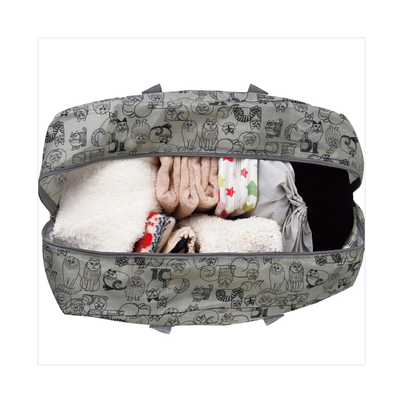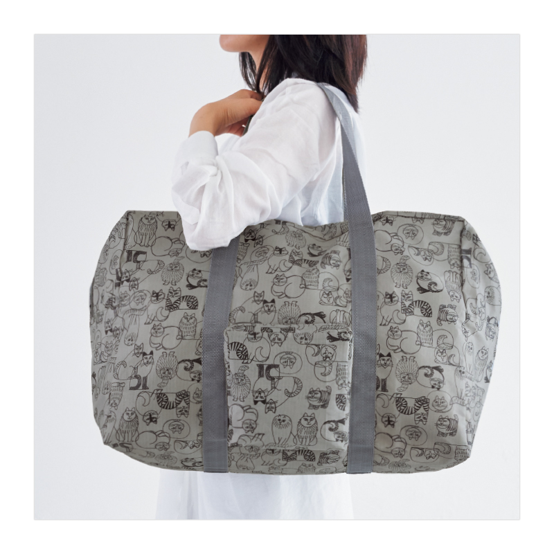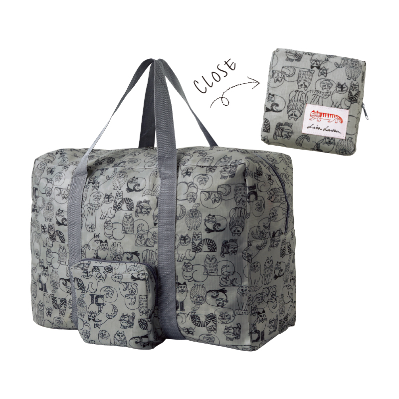 世の女性を虜にする北欧の人気陶芸家「リサ・ラーソン」の折りたためるボストンバッグが登場!リサが描いた猫のスケッチイラストを全面に使用した大人可愛いデザインに仕上げました。バッグは荷物の多い日やお買いもの、旅行などマルチなシーンで活躍するビッグサイズ。使わないときには、バッグ本体をポケット部分にすっぽりと折りたたんで収納できるので、コンパクトに持ち歩くことができます。スケッチマイキーのタグ付き。