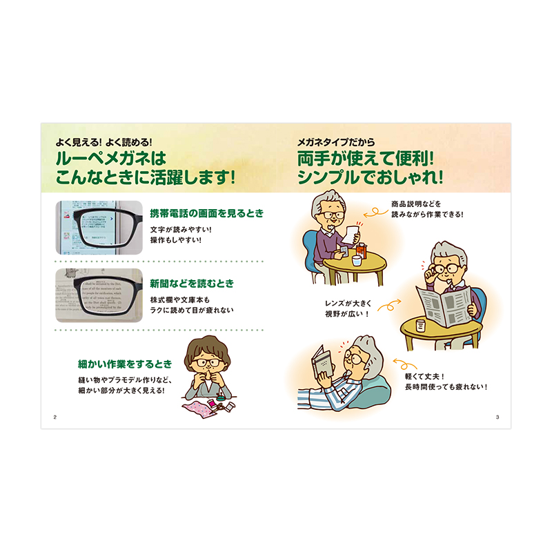 年をとるごとに視力が弱まり、家や会社等で新聞や資料、レポート等を読むときに、小さい文字が見えにくくなってきて苦労している方々に向けたルーペメガネです。仕事や家事、手芸作業などの趣味に使える、ハンズフリーのメガネ式拡大鏡で、フレームはどんな方にも似合うシンプルなスクエアタイプです。