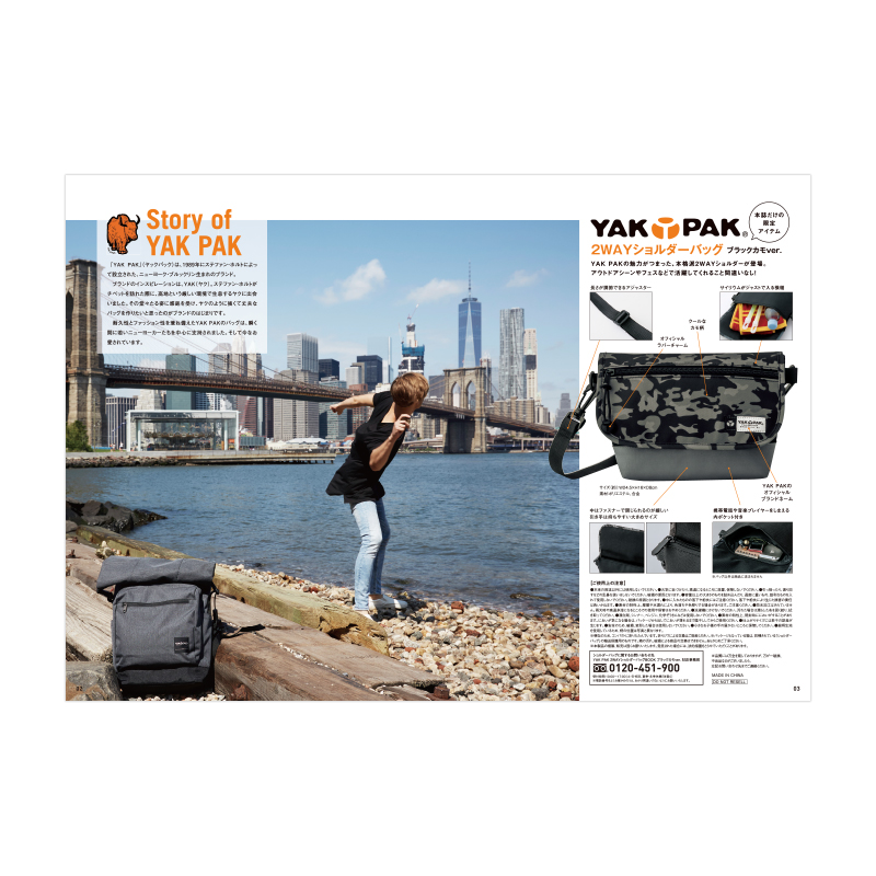 ニューヨーク・ブルックリン発の人気バッグブランド「ヤックパック」の公式ファンブック第2弾が登場!オリジナルアイテムは、ヤックパックでも人気のショルダーバッグ。クールなブラックのカモ柄がおしゃれ。オフィシャルタグや引き手、内ポケットなど、細部にもこだわった本格仕様です。バッグは、サイリウムがすっぽり入るサイズ。ペットボトルやタオルなど見た目以上に収納できるので、アウトドアやフェスなどのアクティブシーンにもぴったり。カバーガールに筧美和子さんを迎えた、スペシャルな一冊が誕生しました!ヤックパックの人気アイテムをお届けするカタログが付いて、本体1270円+税のスペシャルプライスでお届けします!
