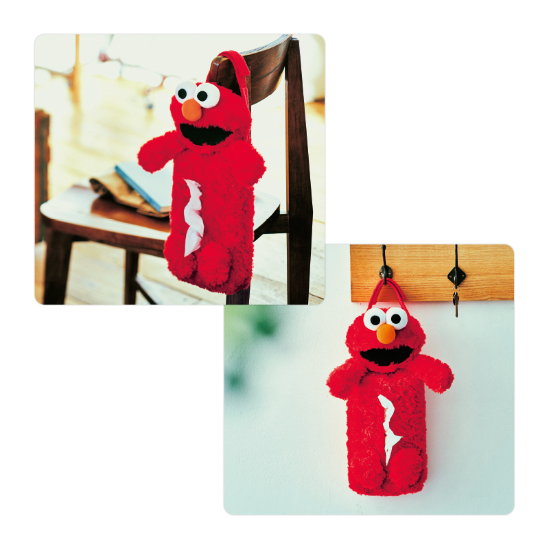 アメリカの人気TV番組『セサミストリート』の中でも絶大な人気を誇るエルモがティッシュケースになって登場。もこもこのエルモのティッシュケースは、壁や車の座席に掛けて使うことも可能。お部屋を可愛く彩るインテリアアイテムとしても◎。セサミストリートのキャラクターや最新グッズがわかるミニBOOK付き。