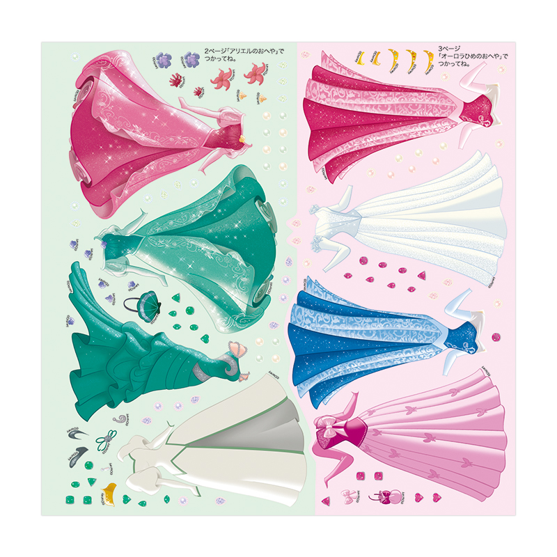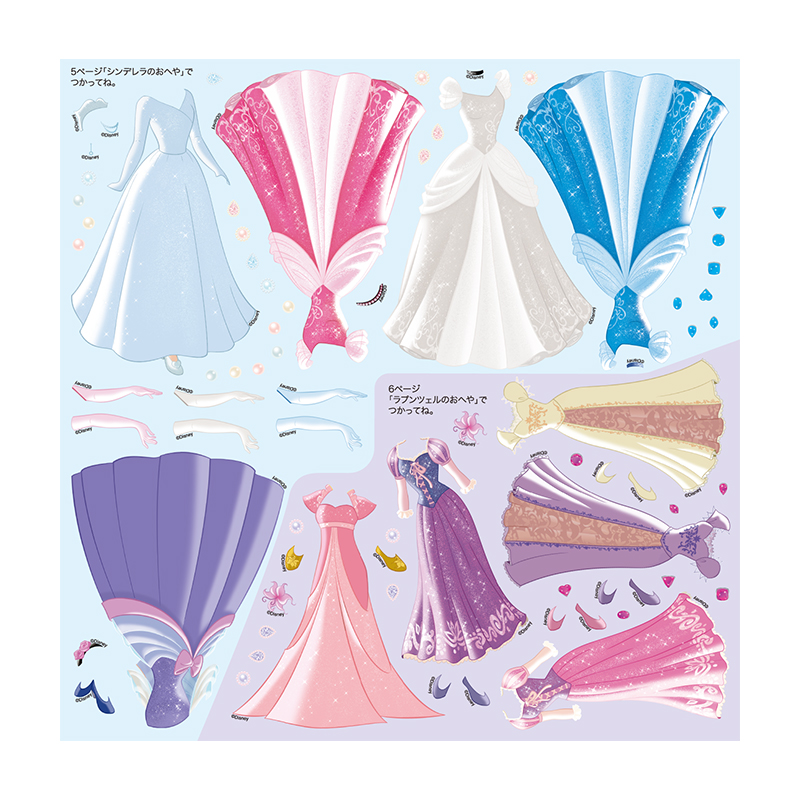 9人のディズニープリンセスたちのすてきなドレス・ぼうし・アクセサリーなどのシールが、たっぷり600まいつまった着せ替えシールブックです。定番のドレスはもちろん、乗馬スタイルやスイーツパーティ、ハロウィンなど、特別な日のドレスも新たに収録しました。プリンセスにあこがれる女の子が大好きな着せ替え遊びが、たっぷり楽しめる一冊です。