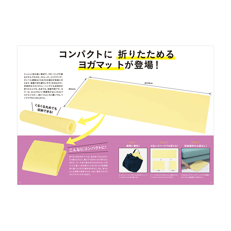 誰もが知っている大ヒットアイテム「ヨガマット」がスッキリ便利な大きさになって登場です。室内でストレッチや筋トレをする時だけでなく、野外ヨガや旅行・出張時にも持ち運べちゃう、折りたためるヨガマットがお求めになりやすいお値段で実現しました。丸めてもたたんでもいいから外出時もかさばらず、お部屋でもベッド下やソファ下へスリムに収納できるので置き場所にも困りません。クッション性のある軽い素材なのに丈夫で使いやすさバツグン!カラーは、可愛いのに大人の雰囲気もあるパステルイエローです。ミニブックには、国際トレーナー資格(NSCA認定)をもつタレントの紅蘭さんが登場!ヨガマットを使ったダイエット効果バッチリのスタイルアップエクササイズを紹介します!