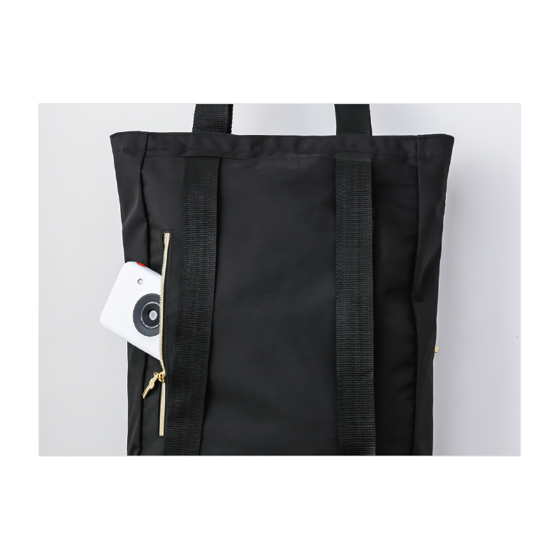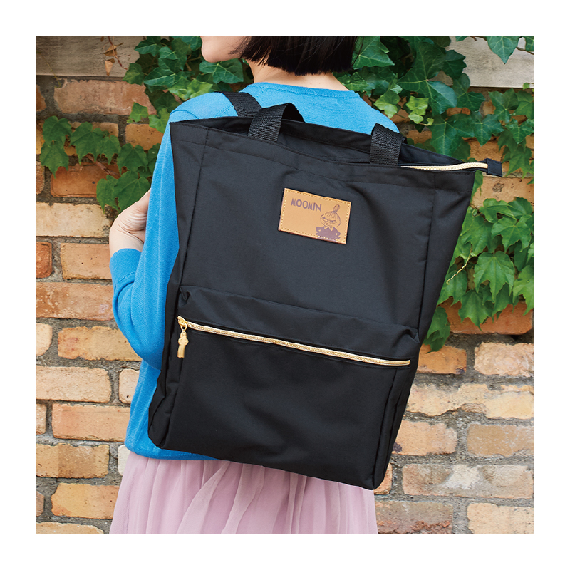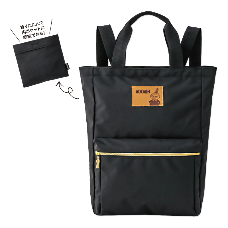 大人気の「ムーミン」から、おしゃれで便利な2WAYトートリュックが登場!トートとしてもリュックとしても使えるシンプルなスクエアシルエットのバッグは、デイリー、レジャー、トラベルなどあらゆるシーンで大活躍間違いなし。しっかり丈夫なポリエステル生地を使用し、カラーは高級感と合わせやすさを兼ね備えたブラック。リトルミイをプリントした本革タグと、ニョロニョロをかたどったゴールドのファスナーチャームがアクセントになっています。さらにコンパクトに折りたたんで内ポケットに収納可能。機能性バツグンのアイテムです。