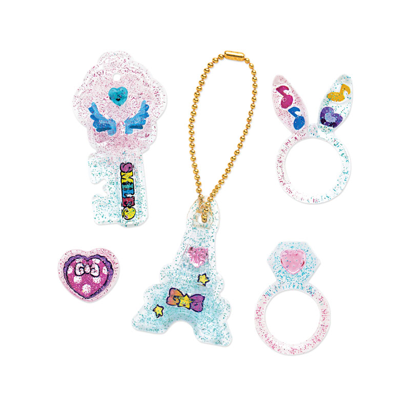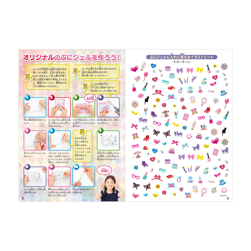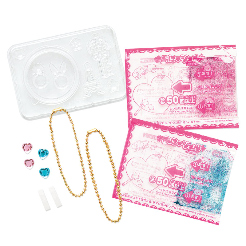 セガトイズの人気玩具「ぷにジェル」がお手軽に楽しめるスペシャルキットです。ピンクとブルーのラメ入りジェル(各1袋)のほか、オリジナル型、ラインストーン(4個)、ボールチェーン(2本)、穴あけ棒(2本)がセットに。付属冊子の絵柄を切って、ジェルと一緒に入れて固めることもできます。