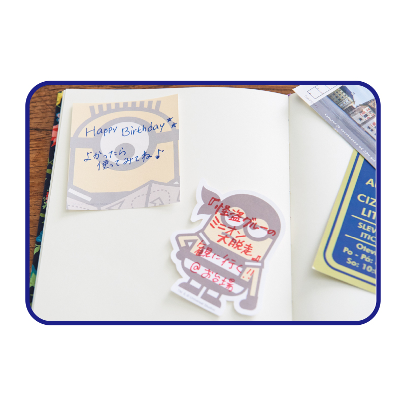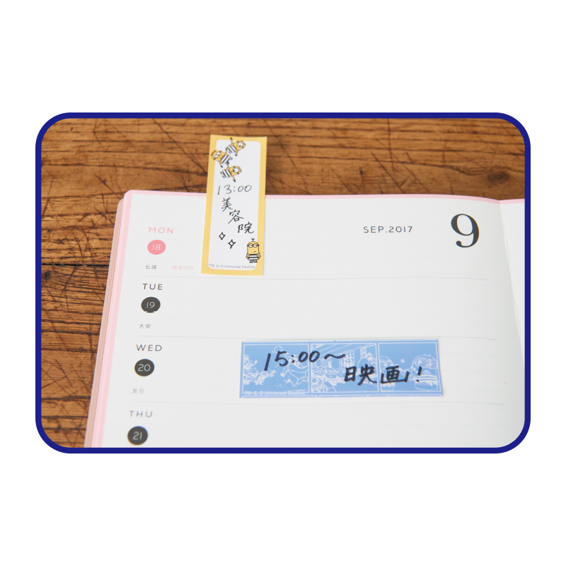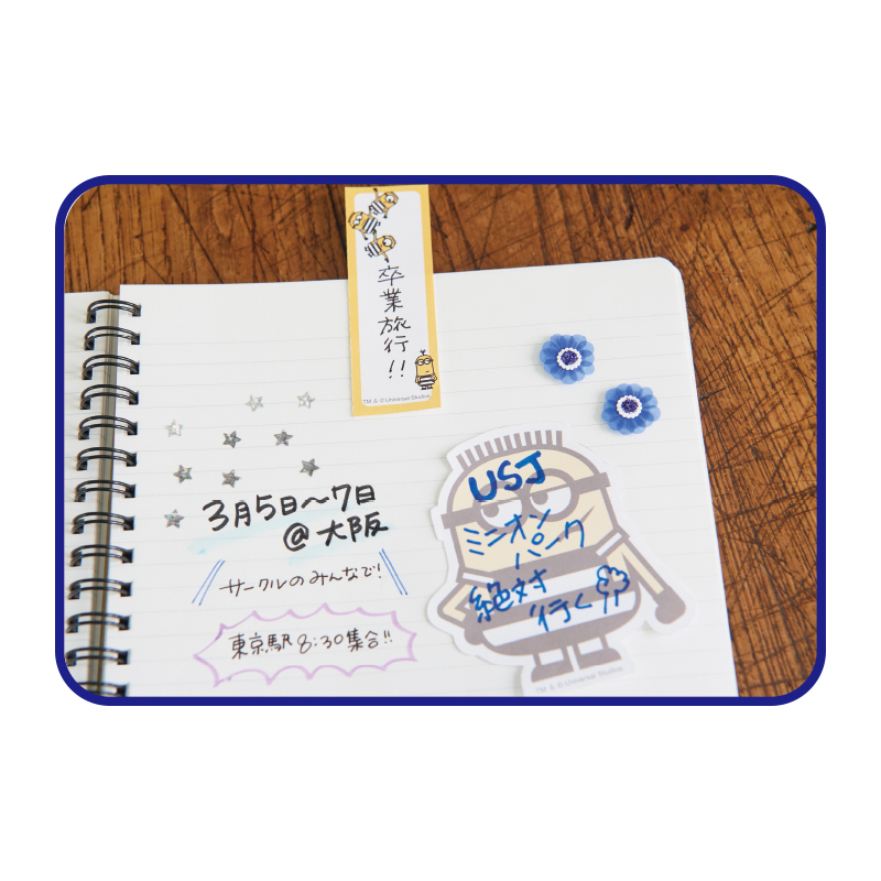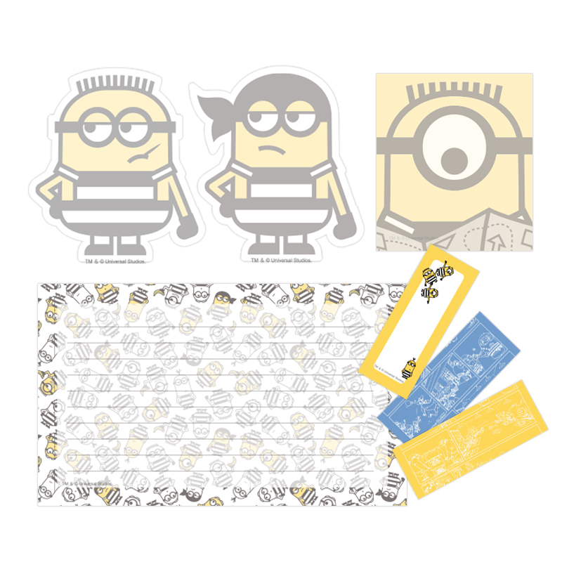 ローソングループ限定商品!新作映画の“ふせん”と“メモ帳”のスペシャルセット!人気映画「怪盗グルー」シリーズの最新作『怪盗グルーのミニオン大脱走』から ふせん&メモBOOKが登場。最新作に登場する囚人服を着たミニオンのイラストを使った、ふせん6種(各15枚)とメモ1種(15枚)がセットになった1冊。メモを残すのはもちろん、手帳のデコレーションとしても可愛い、スペシャルなセットです。