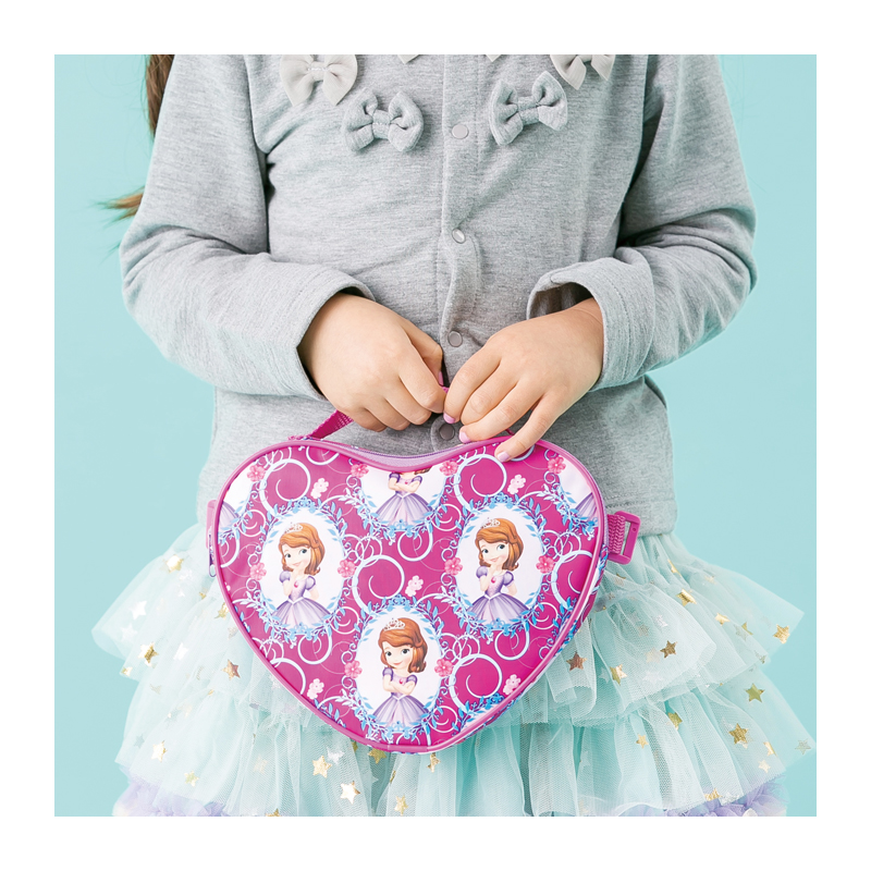 キュートなハート形のピンクバッグは、持っているだけでハッピーな気持ちになれそう!ちょっとしたおでかけにぴったりのサイズです。ソフィアといっしょに、色んなところへ遊びに行ってね♪