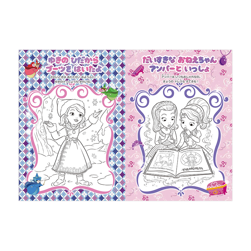 ぬりえや迷路、なぞりがきにドレスコレクションが楽しめるミニブック付き。ぬりえはデザイナーになった気分で、あなたらしい色でソフィアをおしゃれに塗ってね!ソフィアのお話をおさらいしたり、登場人物の名前をなぞりがきで書いて覚えたりして、ソフィアといっしょに遊ぼう♪
