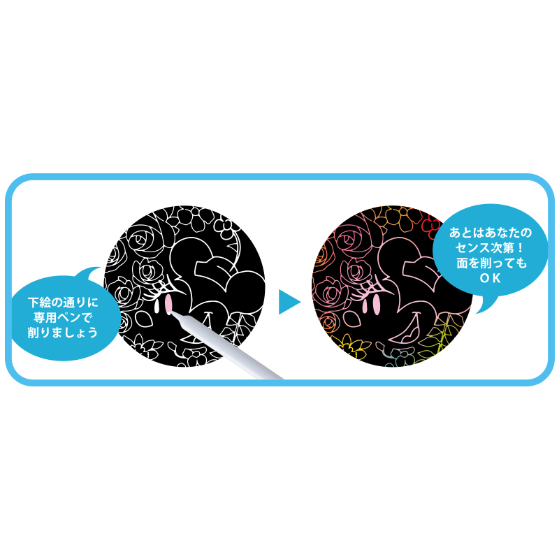 黒いスクラッチ面を専用ペンで削ると、美しい色や、キラキラ光る