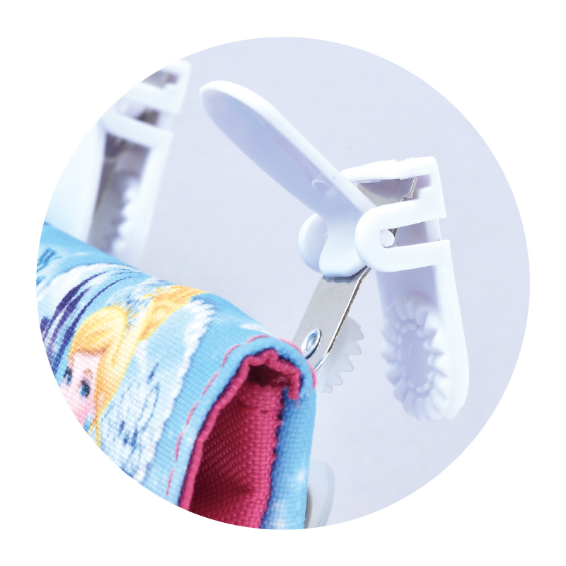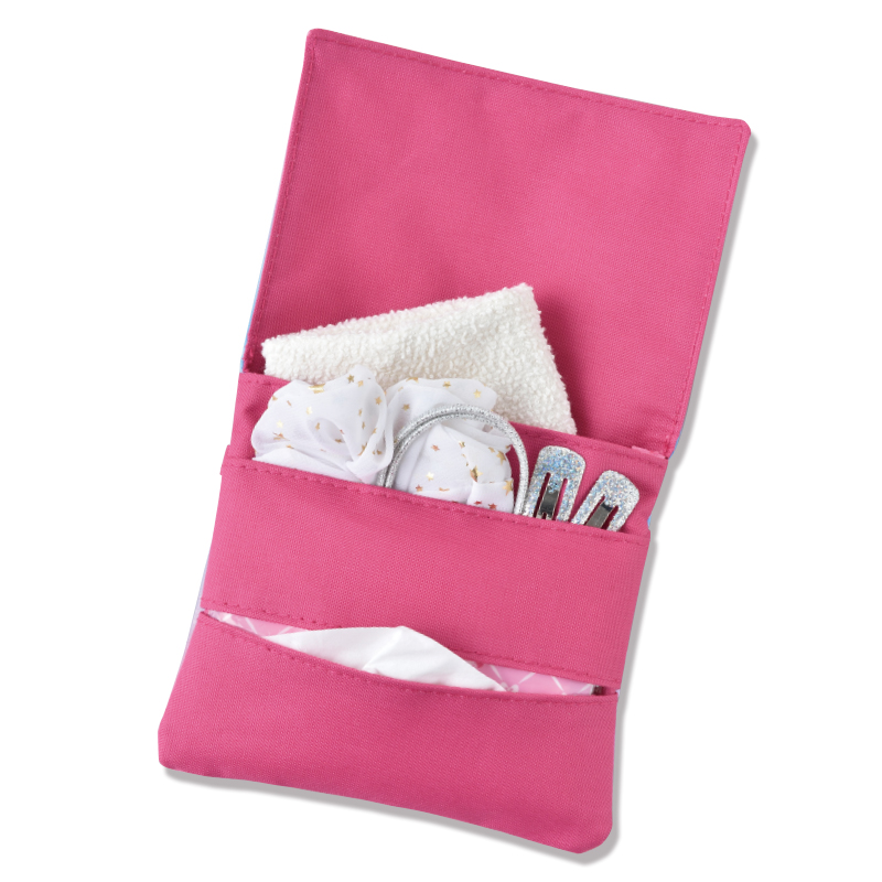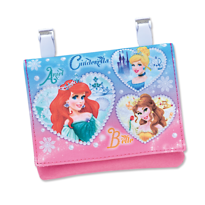 ポケットのない服や、あっても小さくて必要な物が入らない時などに、クリップで挟むだけでポケットが付けられる便利な「ポケットポーチ」が登場。「移動ポケット」「つけポケット」などとも呼ばれ、幼稚園児~小学生にとって必須になりつつあるアイテムです。ティッシュケース+2つのポケット付きで、お子さまに持たせたいハンカチ&ティッシュだけでなく、おしゃれな女の子のヘアアクセや鏡なども入れられます。表と裏には人気のディズニー・プリンセスをかわいくおしゃれにあしらいました!