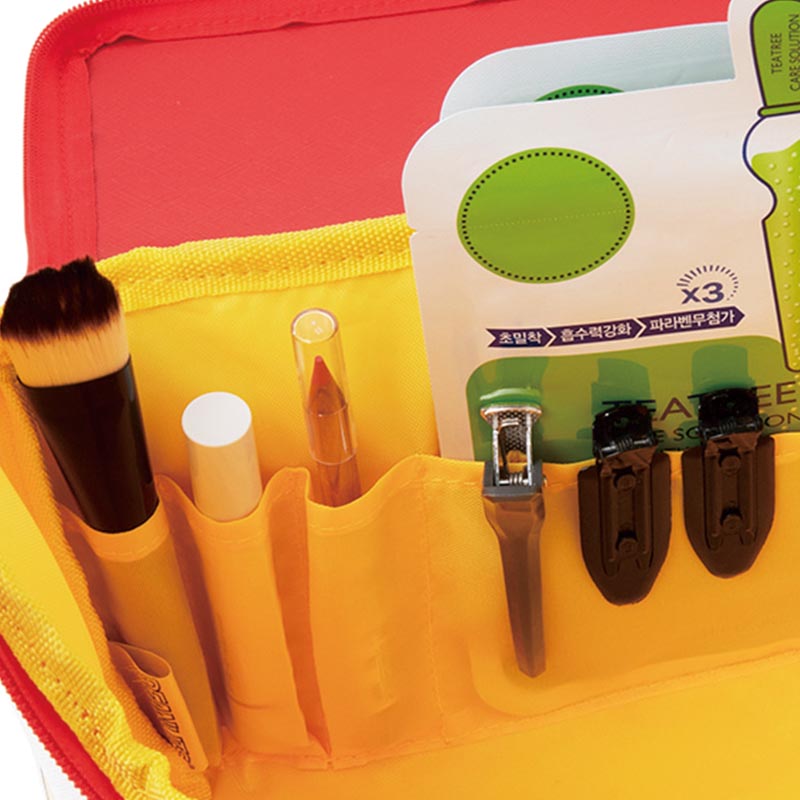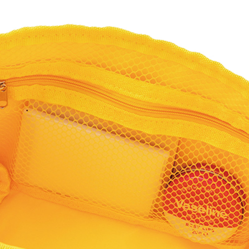 細長いものを立てて収納できるホルダーポケットと、ファスナー付きのメッシュポケットを完備。