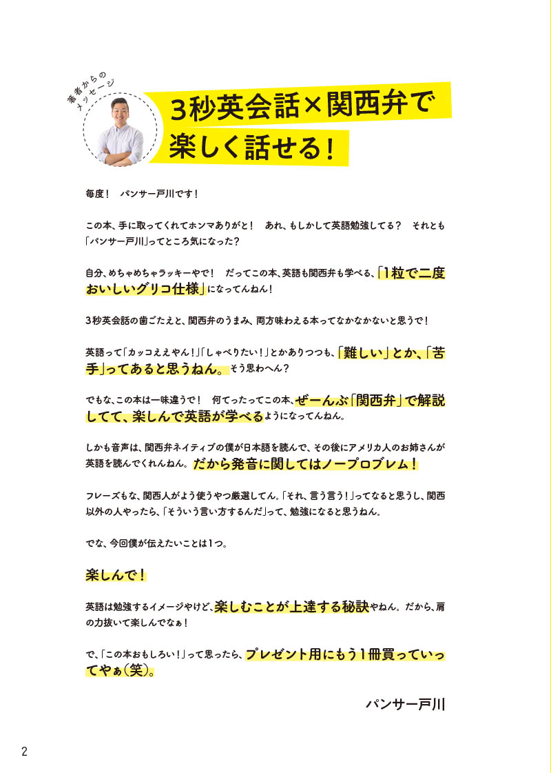 パンサー戸川さんの親しみやすい関西弁と、英語の教科書では教えてくれない実用的な言い回しが盛りだくさん。
