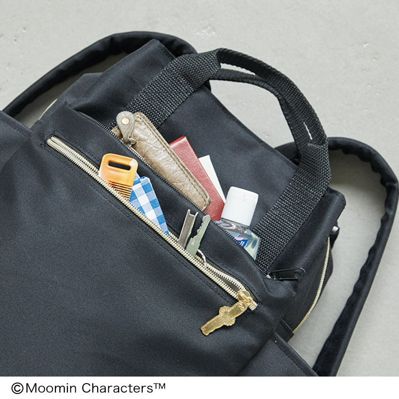レザー調のリトルミイのタグやニョロニョロのジップなど、さりげないムーミン感がおしゃれ。