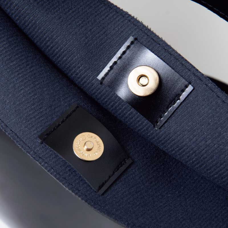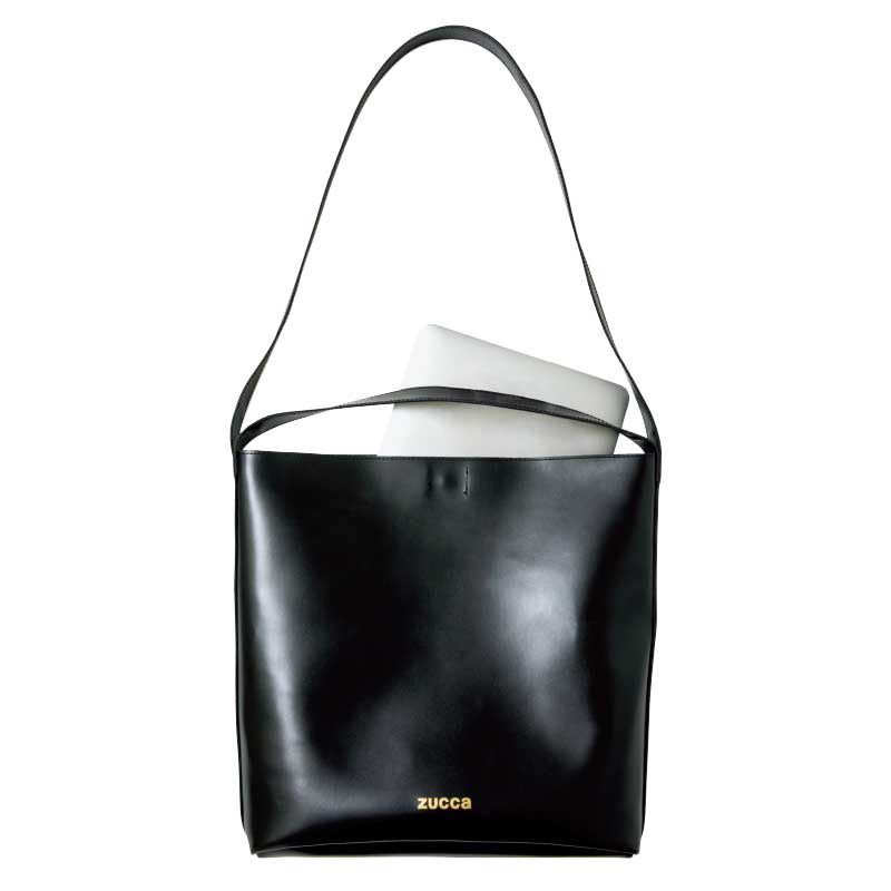 ツヤ感が美しいビッグショルダーバッグは、ハンドル付きで手持ちもできる。