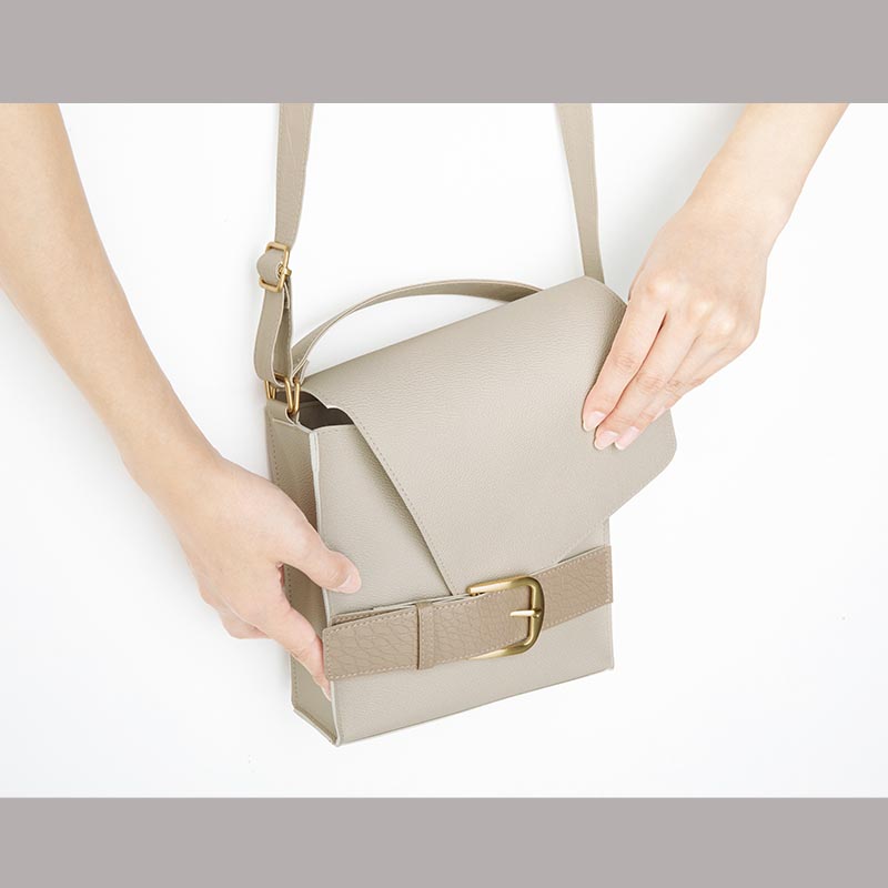 バッグの開閉はフラップをベルトに差し込むだけ。使いたいものをすぐに出し入れできます。
