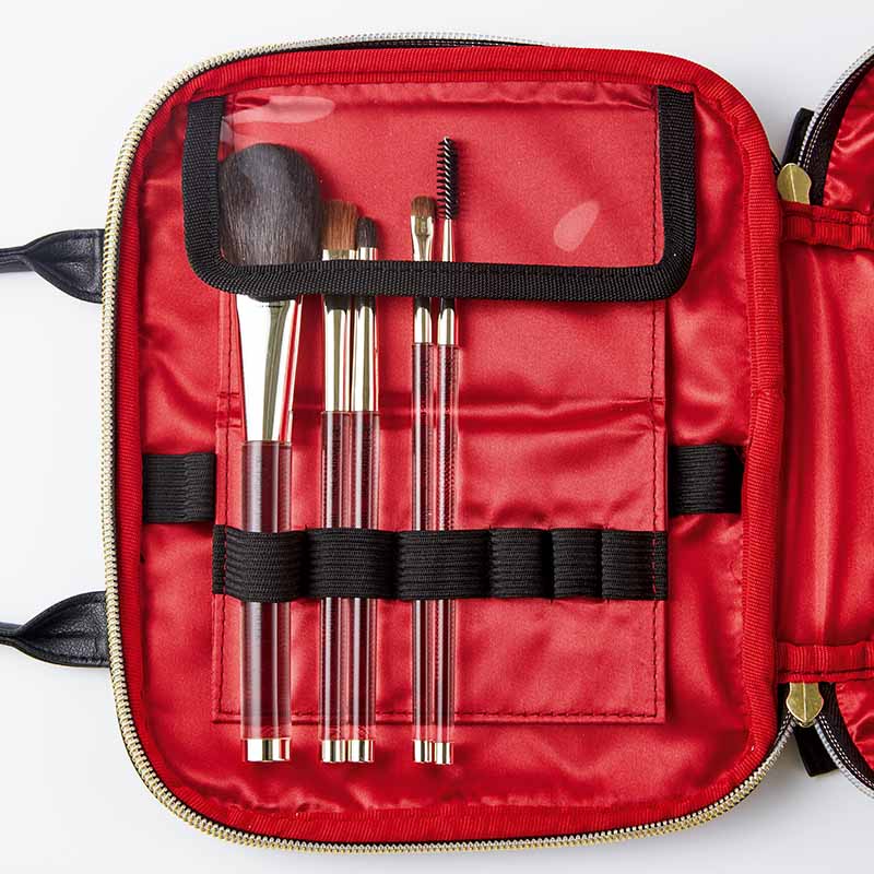 2層仕様で自立する形状なので使いやすさも折り紙付き。13本収納可能なブラシホルダーには、メイク時にサッと立てられる仕掛けが。使いたいものがすぐに取り出せてとても便利です。ポケットは充実の7箇所。
