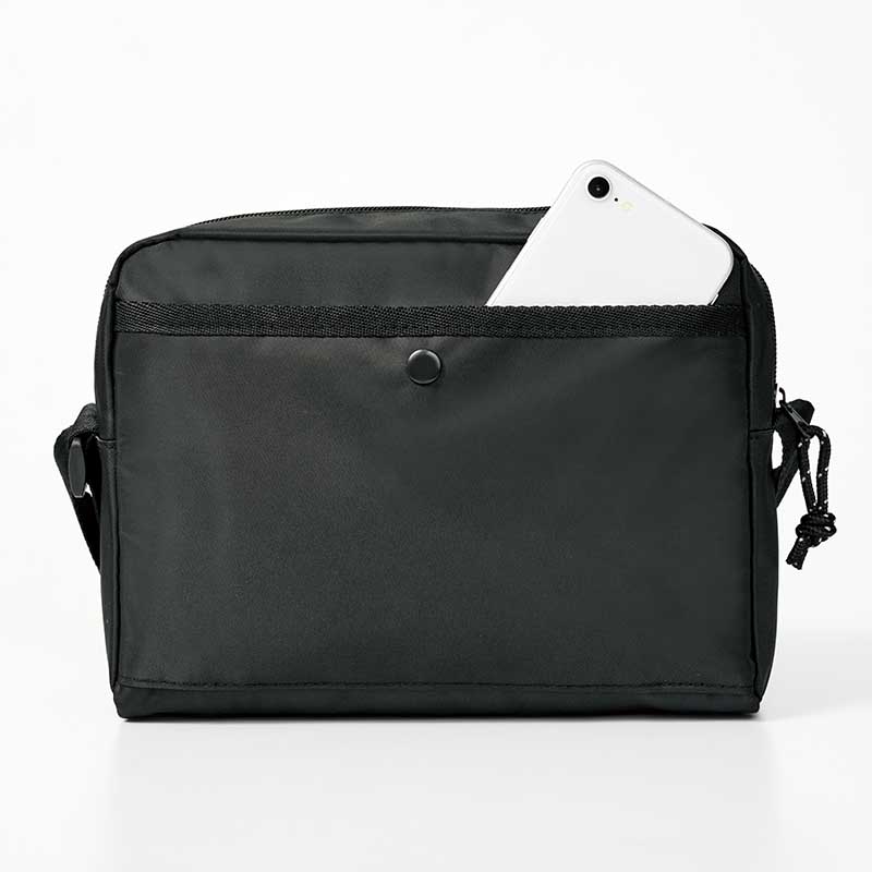背面ポケットは、スマホやパスケースなど、サッと取り出したいものをイン。スナップ付きで持ち物が飛び出すのを防げて安心。