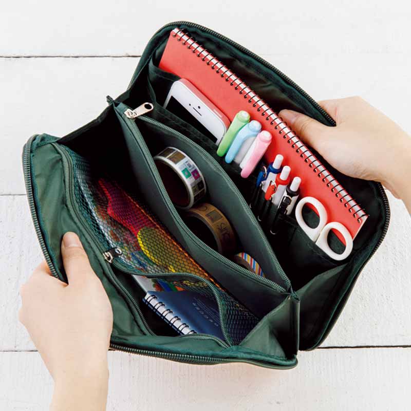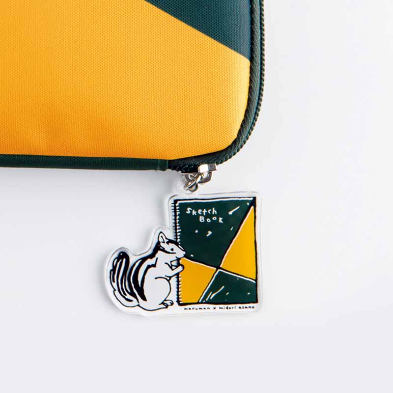 薄手のA5ノート、手帳、メモ帳、はさみ、ペン、ふせんにシール、スマホなど、こまごましたものをまとめて整理収納できます。浅野みどりさんの描くかわいいリスのチャームにも注目!