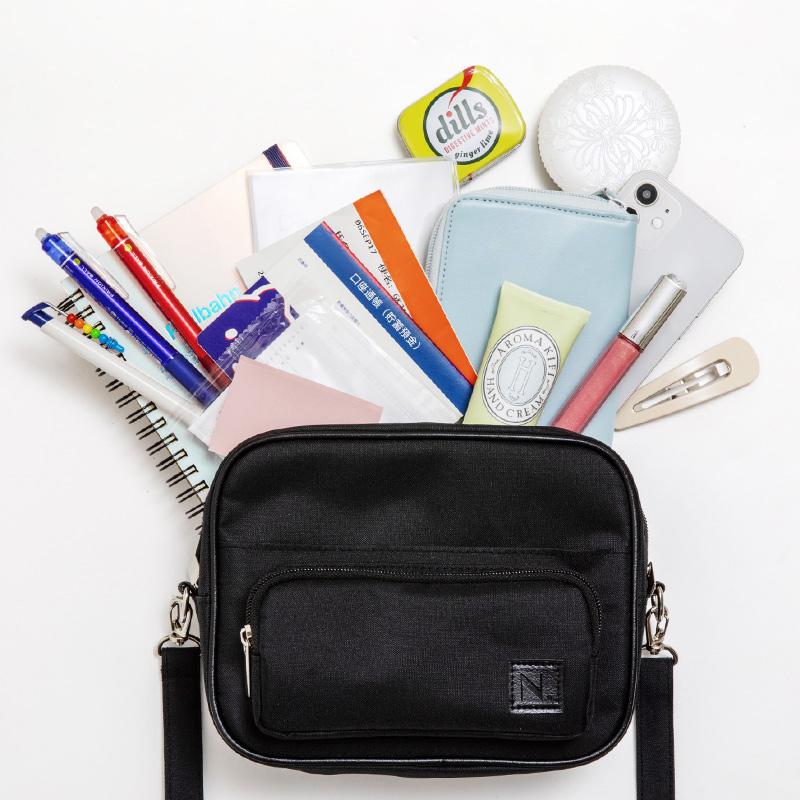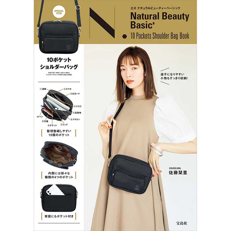 「N.」より初となる、ブランドブックの登場です! スペシャルアイテムは10ポケットショルダーバッグ。ストラップは長さ調節・取り外し可能でその日の気分によって使い方を変えることができます。バッグは外ポケット2つとファスナーポケット2つ、計4つに分かれています。外ポケットはチケットやスマホを入れるのにちょうどいいサイズ。ICカードを入れるとぴったりなサイズのポケットもついています。ファスナーポケットの中は、メッシュ素材や仕切りつきなど、細かいものを入れるのに便利な仕様になっています。コンパクトながら長財布も入り、見た目以上の大容量で使いやすいバッグです!