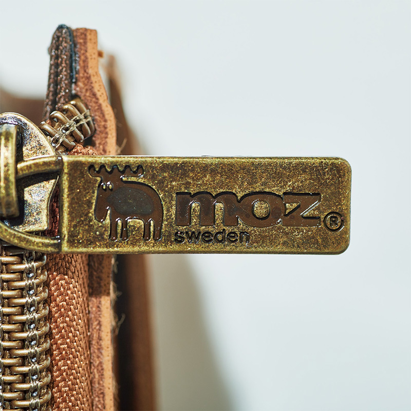 高級感あるアンティークゴールドのファスナートップにも、エルクとmozのロゴを刻印。