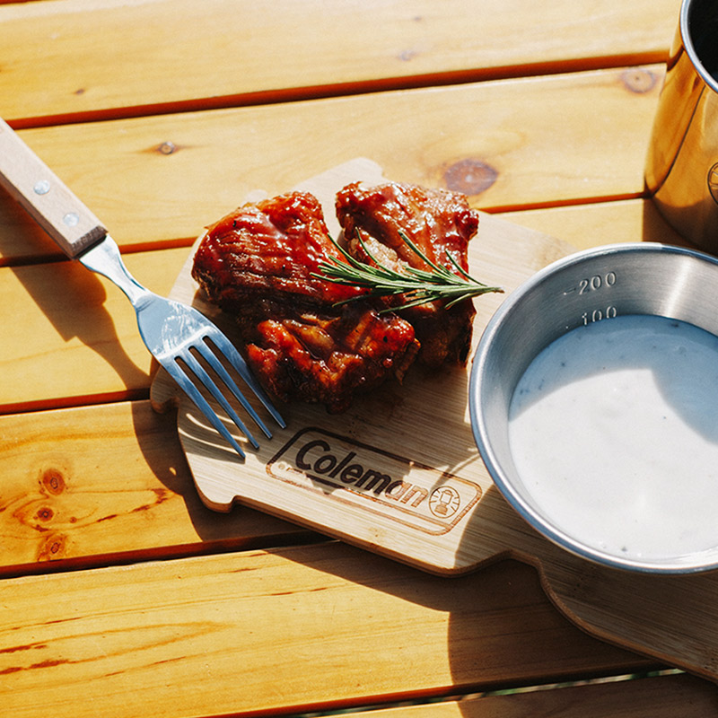 右にある丸いへこみにはコールマンのカップがぴったり。簡単に素敵なワンプレートが完成します。