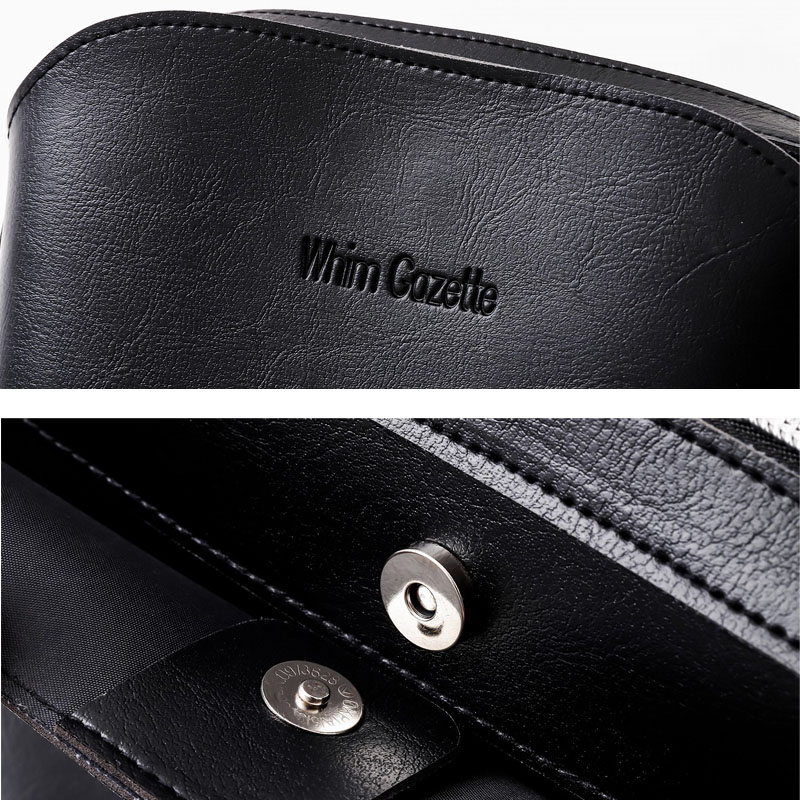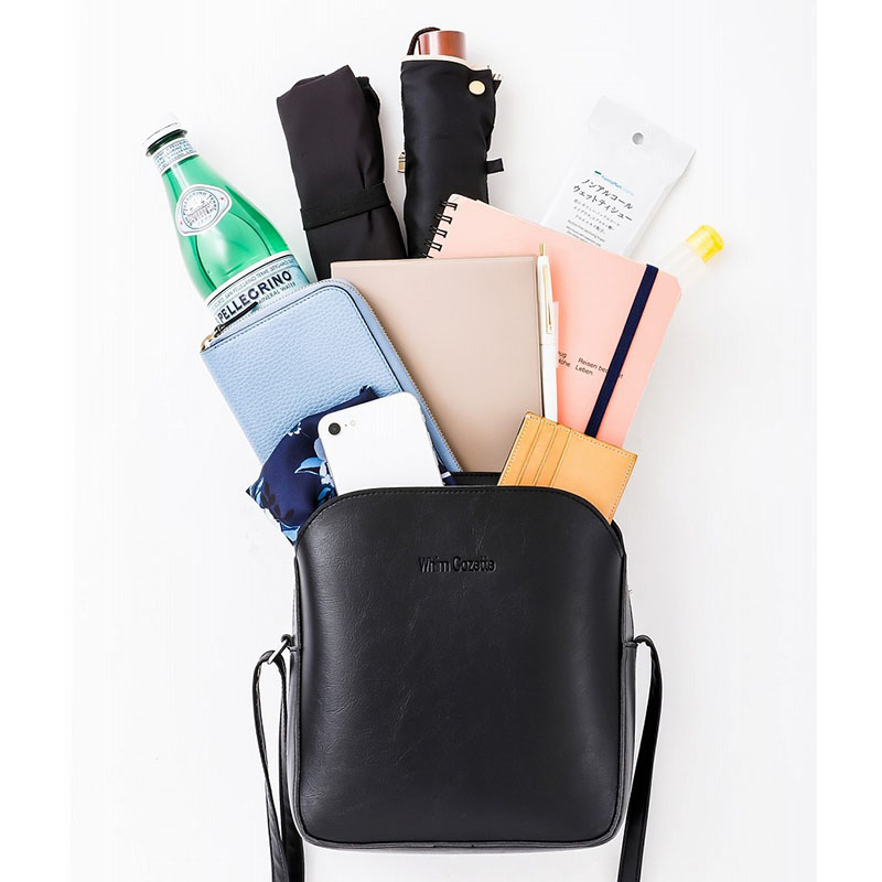 誌面ではエレガントなのにカジュアル、ナチュラルなのにラグジュアリーなWhim Gazetteの定番スタイルを中心にご紹介! スペシャルアイテムは3層に分かれたスクエア型のショルダーバッグ。メイン収納はファスナー付きで、内ポケットも。500mLのペットボトルも入る嬉しい大きさです。外ポケットは前後に2つあるので使い勝手抜群です! ちょっとしたお出かけもWhim Gazetteのロゴ入り合皮ショルダーバッグで一段とおしゃれ度がアップします。服装を選ばず使えるコロンとしたデザインも可愛らしいです。