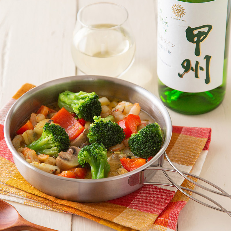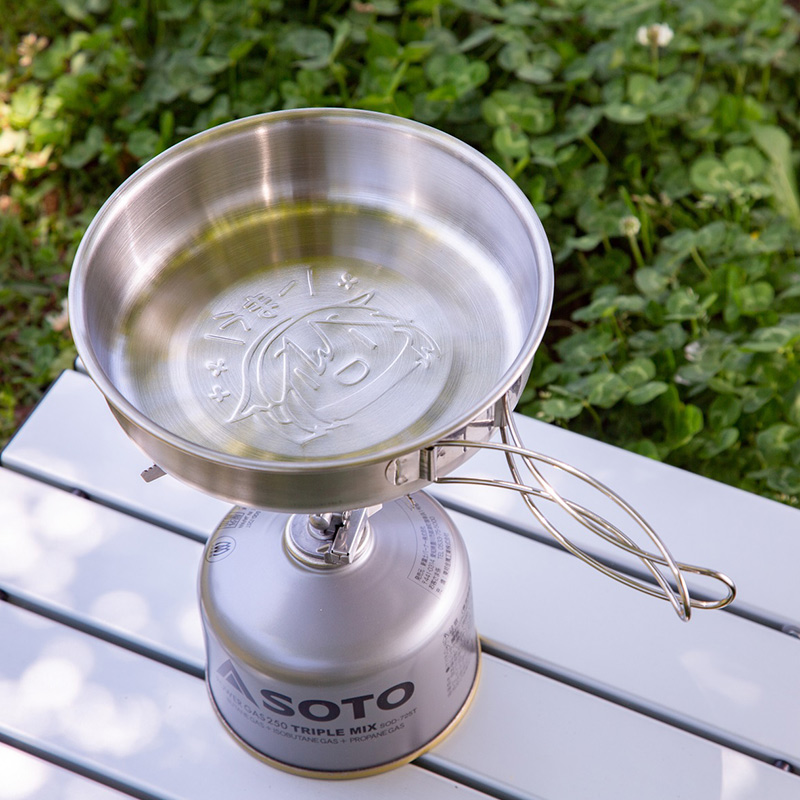 キャンプでも家でも重宝するコンパクトサイズのなべは、持ち手をたたんで収納可。