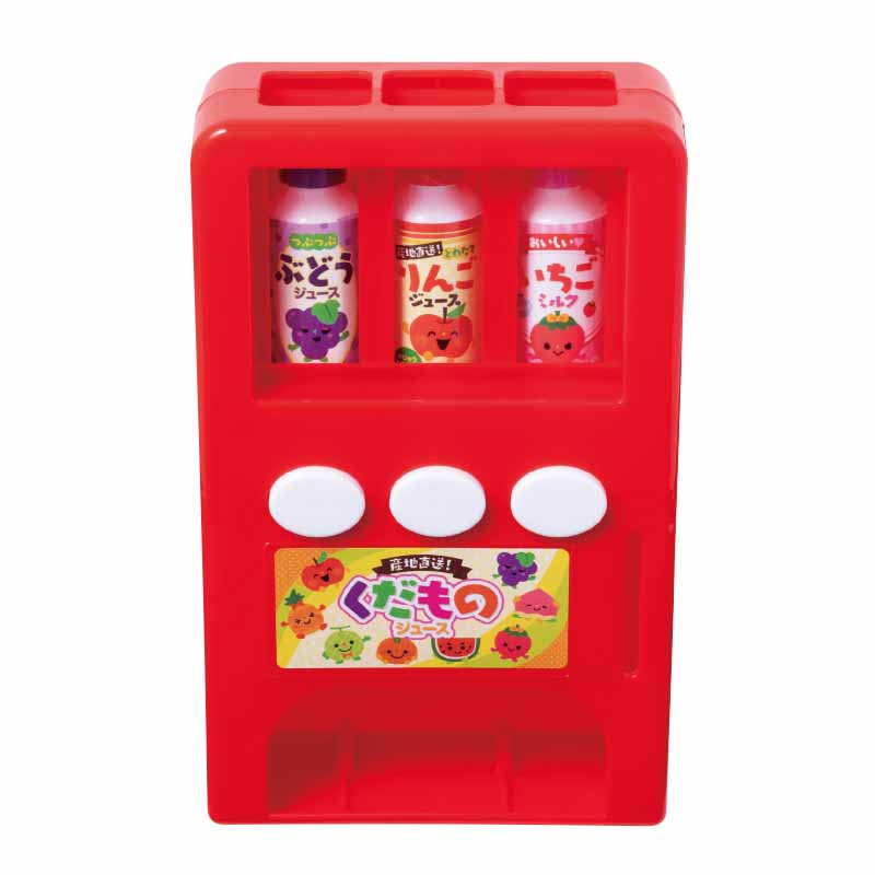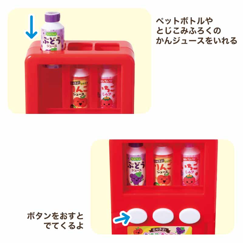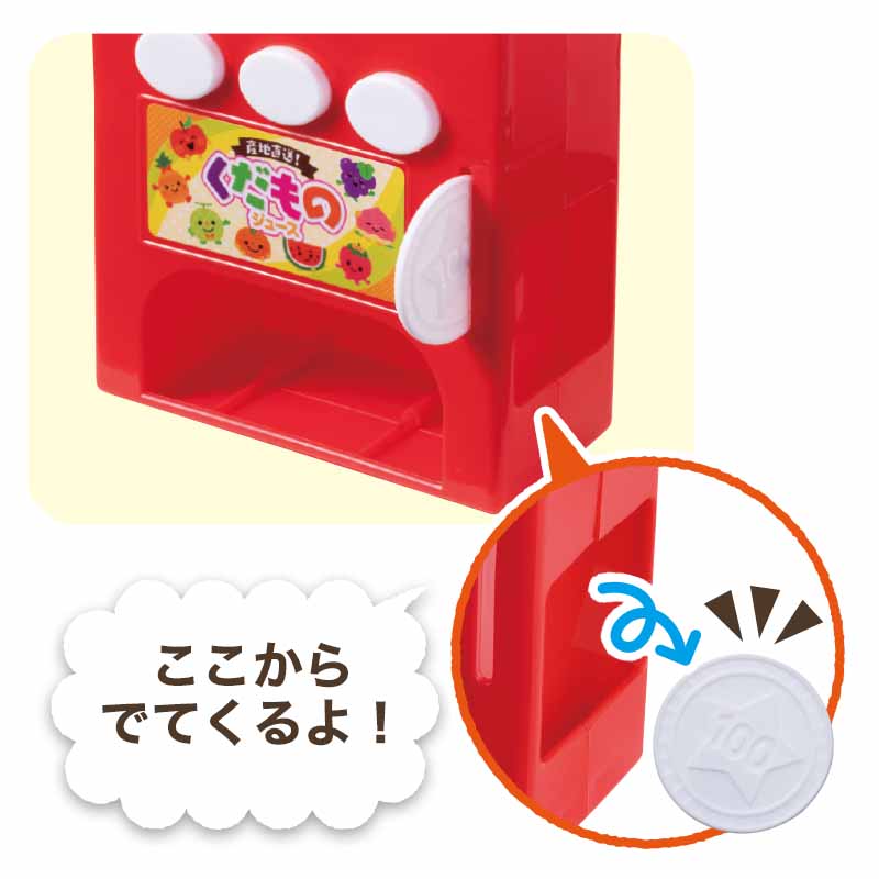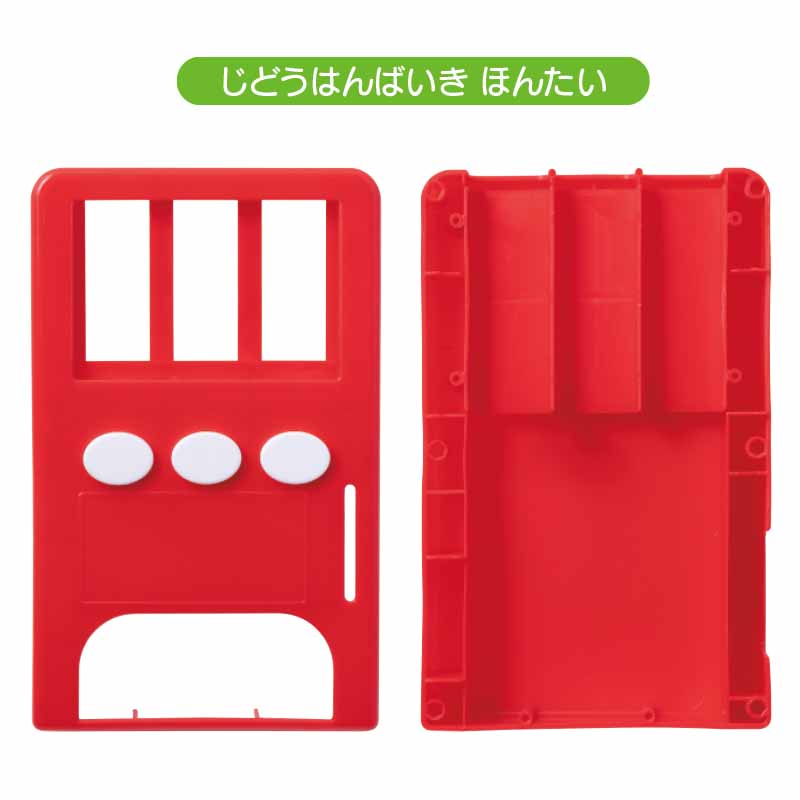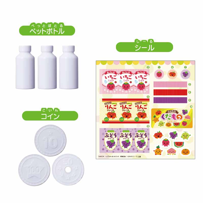 こわれにくいプラスチック製の自動販売機本体とプラスチック製のジュース3本、プラスチック製コイン3枚に紙製のジュース5本が付録です。