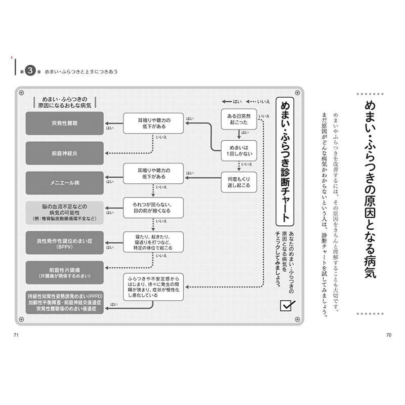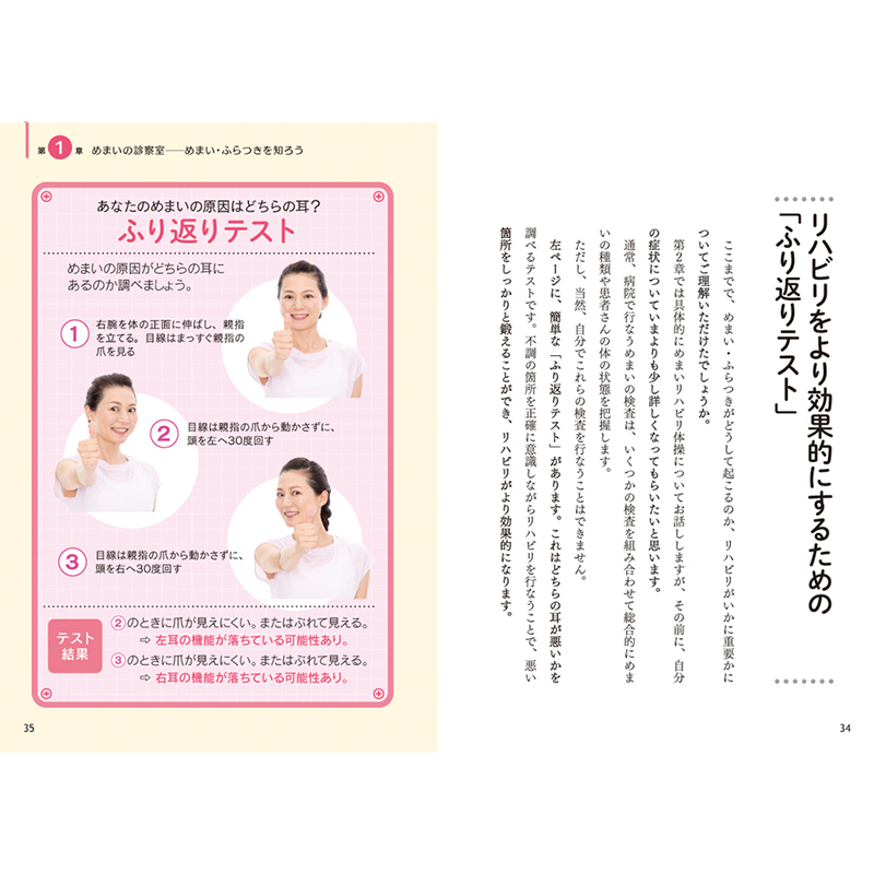 本書では、基本の7つのリハビリ&症状に合わせた3つのリハビリのほか、めまいの基礎知識から、自分でできる症状診断、困った時の対処法、めまいの疑問Q&A、心強い体験談まで、知りたいこと、知っておきたいことが全部わかります。