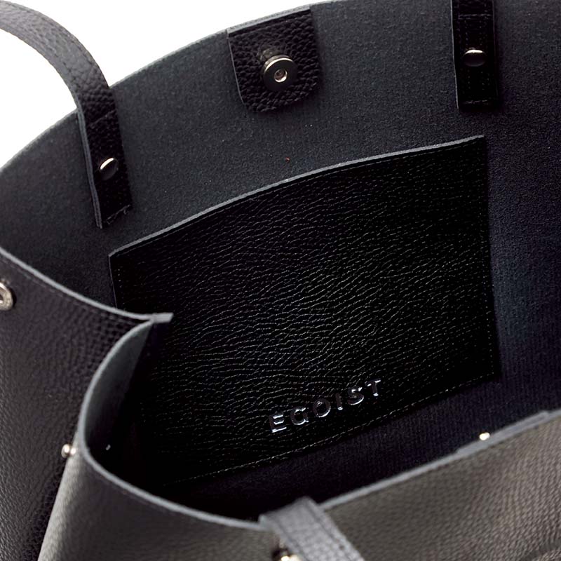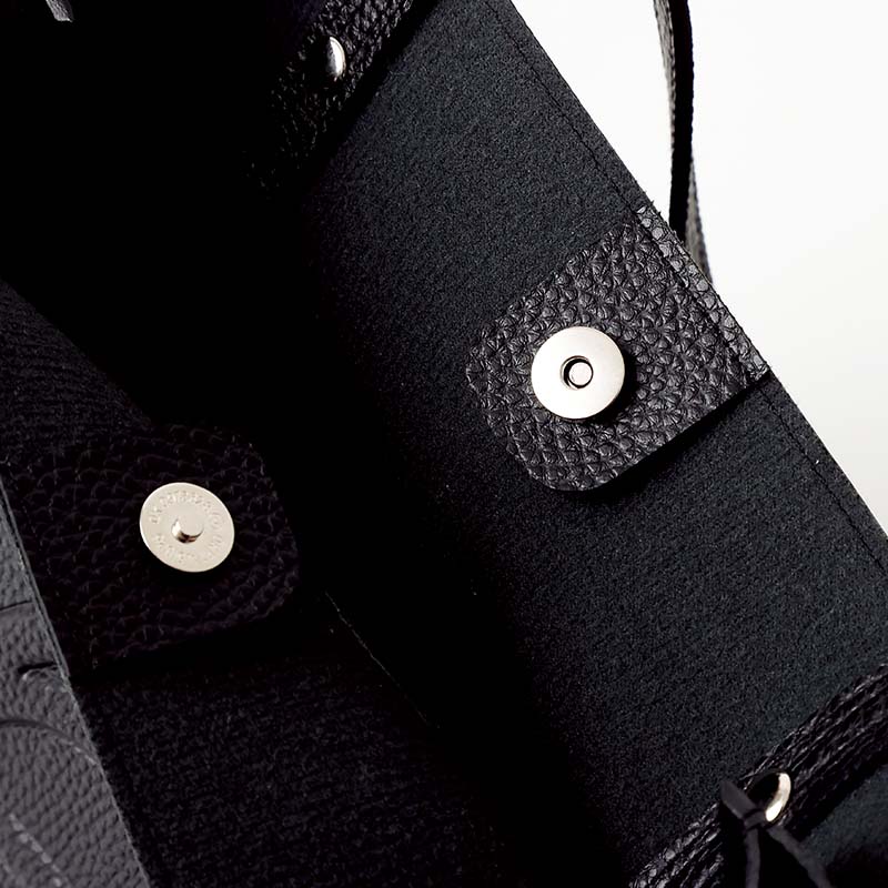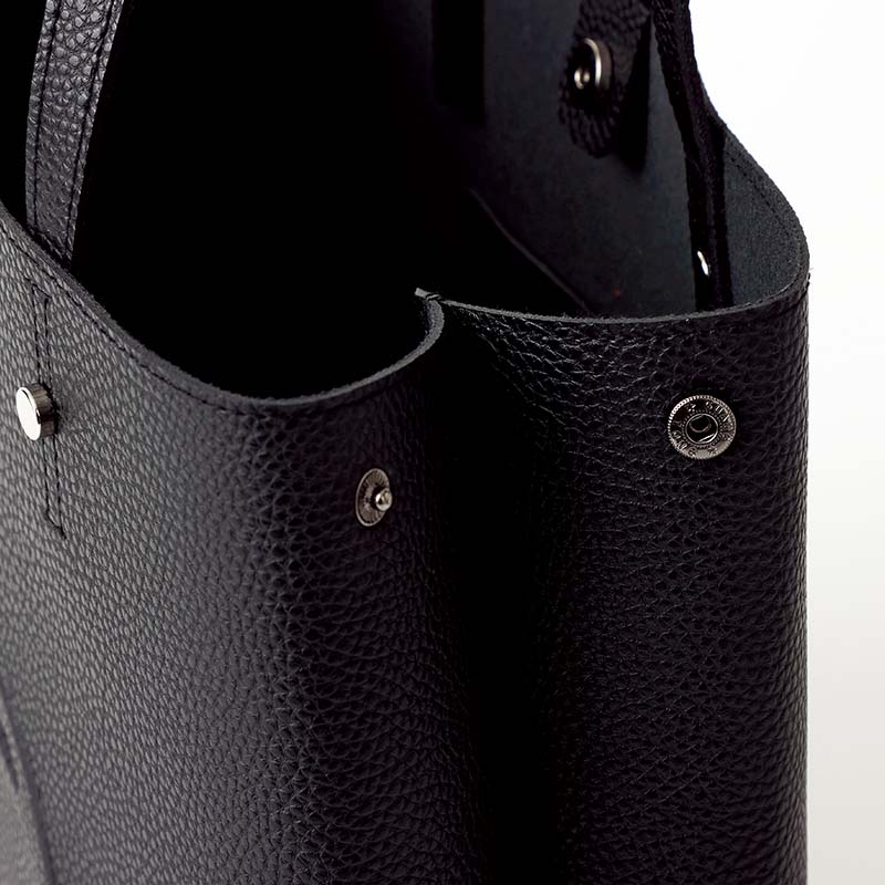 しっかり厚みのあるレザー調生地を採用。マチ部分のスナップボタンで、荷物の量や好みに合わせてシルエットをチェンジできます。