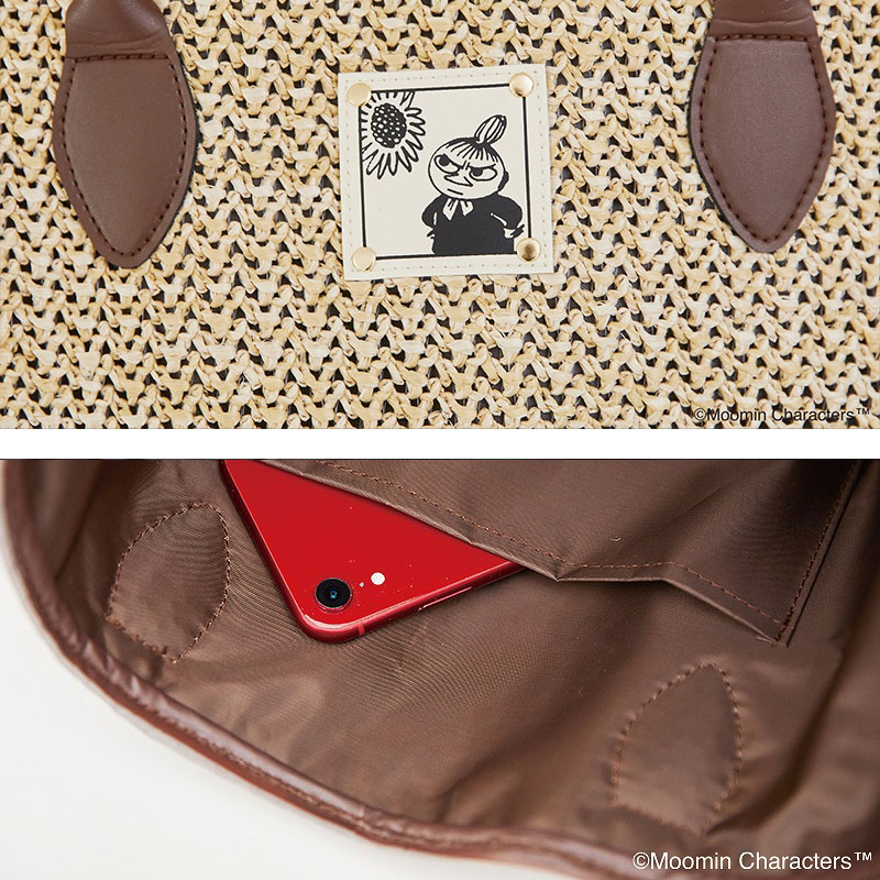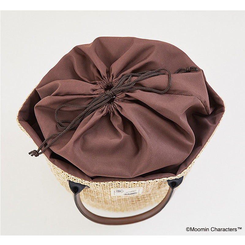 大きな丸形の底面でたっぷり入り、巾着カバーつきで中身を隠せて安心です。どんなコーデにも合わせやすく、自然になじむナチュラルカラーに、リトルミイのかわいいタグつき。レザー調の持ち手が大人に似合う高級感を演出してくれます。スマホやパスケースなどの収納に便利な内ポケットつき。