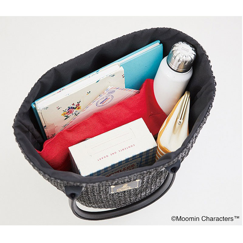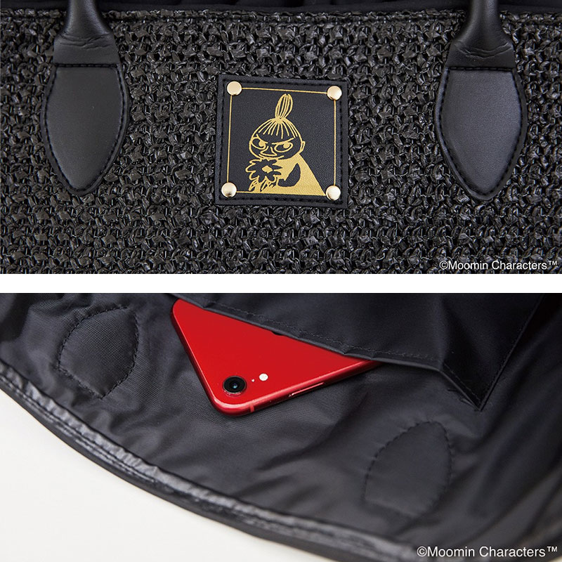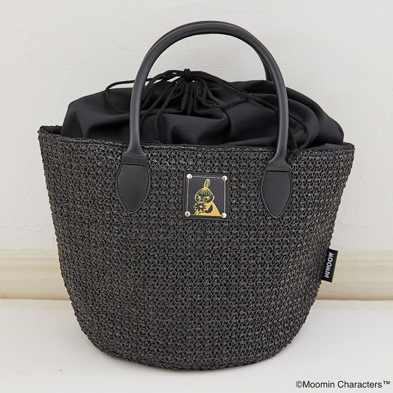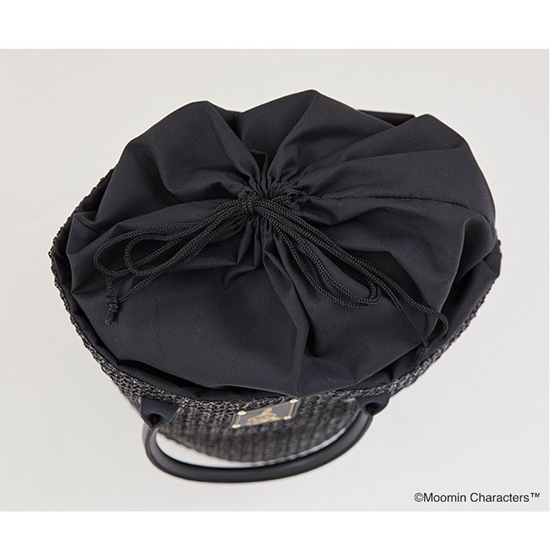 大きな丸形の底面でたっぷり入り、巾着カバーつきで中身を隠せて安心です。どんなコーデにも合わせやすくシンプル&シックなブラックカラーに、リトルミイのかわいいタグつき。レザー調の持ち手が大人に似合う高級感を演出してくれます。スマホやパスケースなどの収納に便利な内ポケットつき。