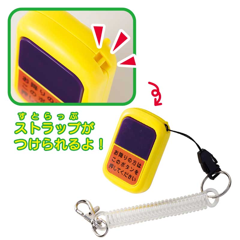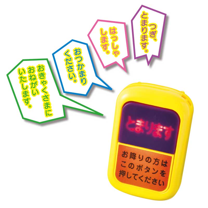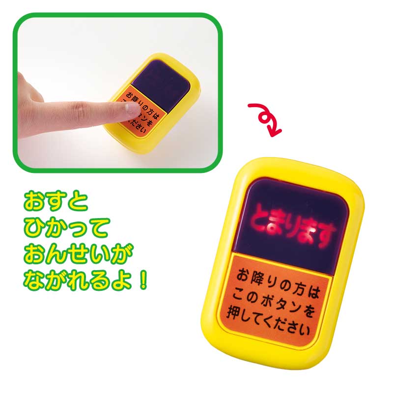 ボタンを押すとピカッと光って「ピンポーン! つぎ、とまります」「はっしゃします。おつかまりください」など本物の都営バスの音声が出る本物そっくりなバスボタンを好きなだけ押して遊べます!