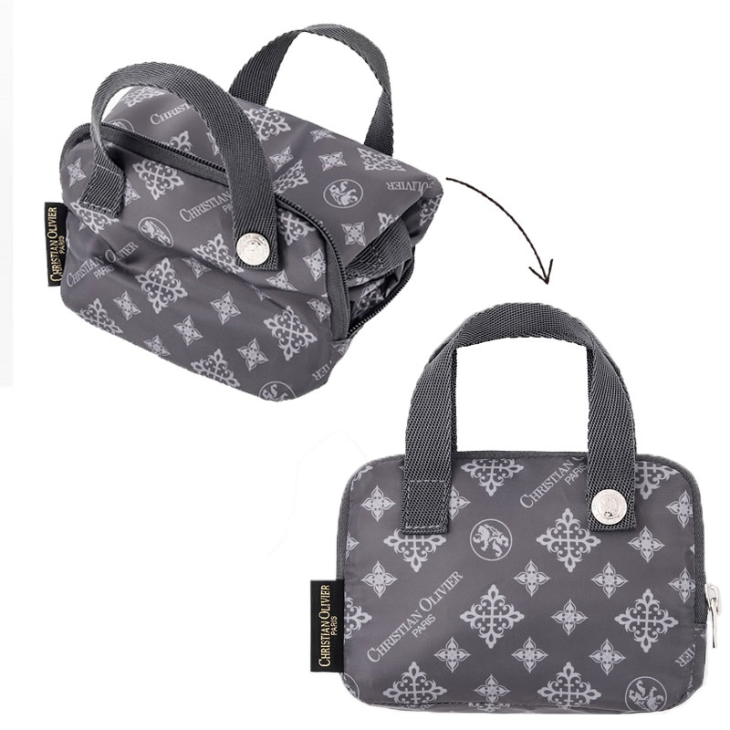 本誌スペシャルアイテムは、大人気のモノグラム柄のなかでも落ち着きのあるグレーカラーのビッグサイズ保冷ショッピングバッグ。保冷バッグなのに小さくたためて軽量。しかも、たたんでバッグのポケット内に収納すると、見た目もかわいいミニバッグ型に変身します。ブランドの刻印入りのボタンを外すと、お手持ちのバッグなどに取り付けられる機能派。