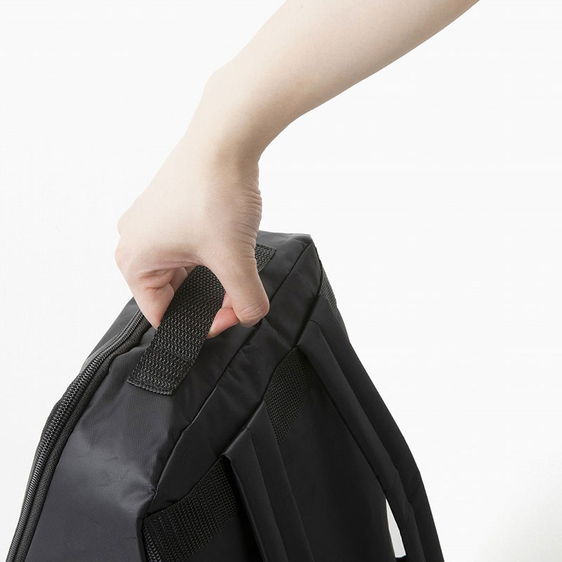 バックパックの上部には持ち手がついており、サッと持ちたいときに便利。フックのあるベビーカーなどにも掛けられます。