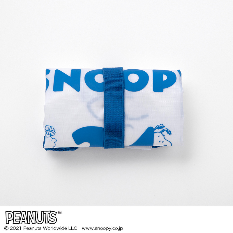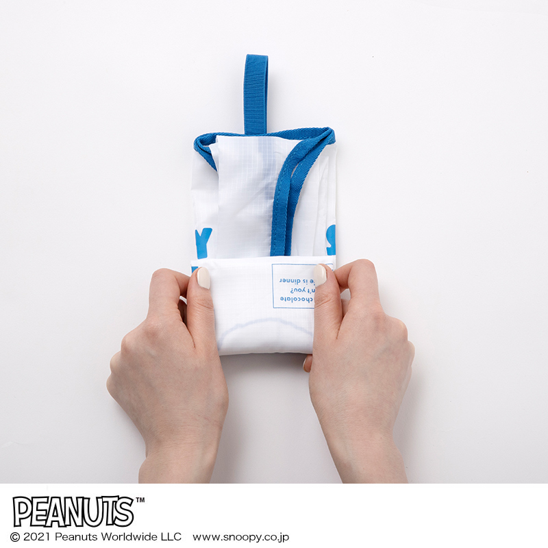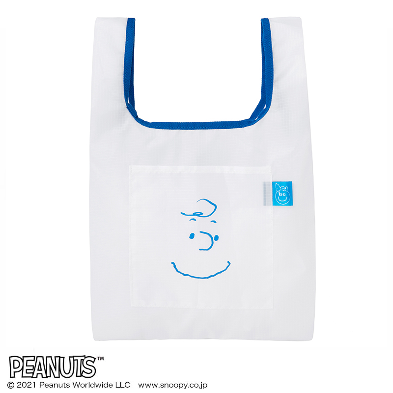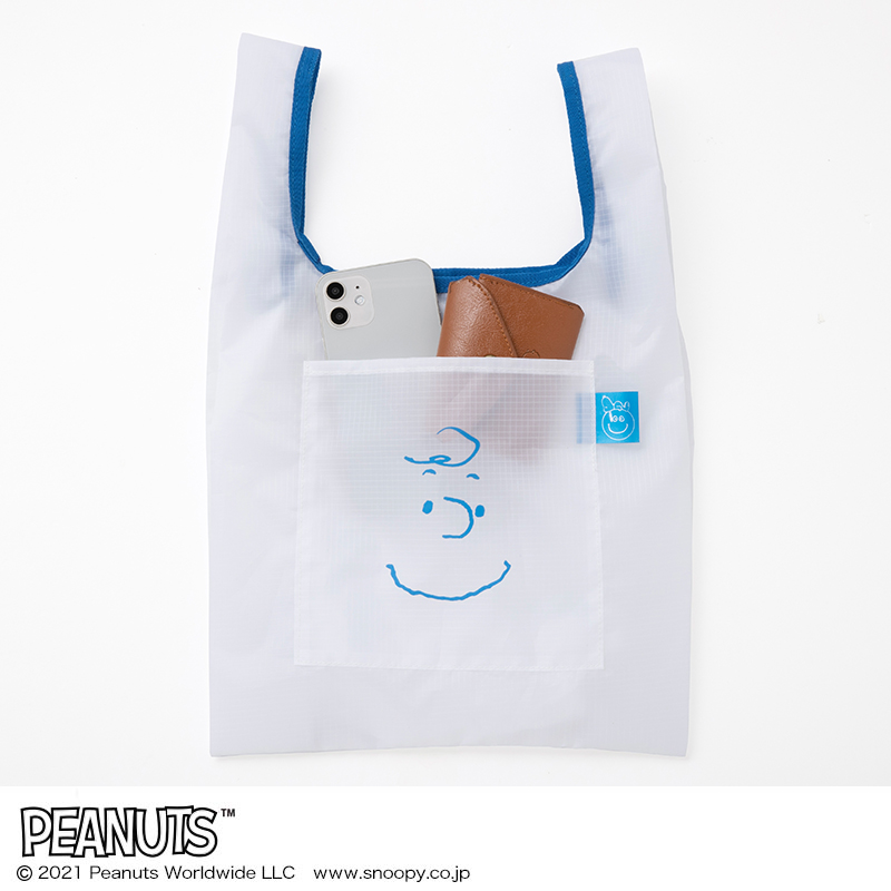 ちょっとしたお買い物にちょうどいいミニサイズで、後ろ面にはスマホやお財布が入る、チャーリー・ブラウンの顔がプリントされたポケットが付いています。ブルー×ホワイトのレジ袋ライクなデザインで、涼しげな印象です。