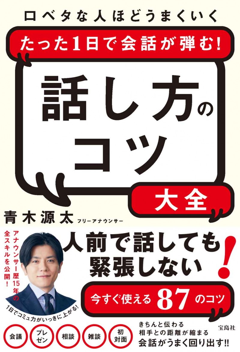 元日本テレビのアナウンサーで、2020年10月からフリーアナウンサー、司会者として活躍する青木源太さんが、日テレアナウンサー時代に得た経験やエピソードをふんだんに盛り込み、口ベタな人でも今すぐに実践できる、 会話が弾む方法や相手にきちんと伝える方法など、87個のコツを具体的かつ丁寧に紹介しています。
