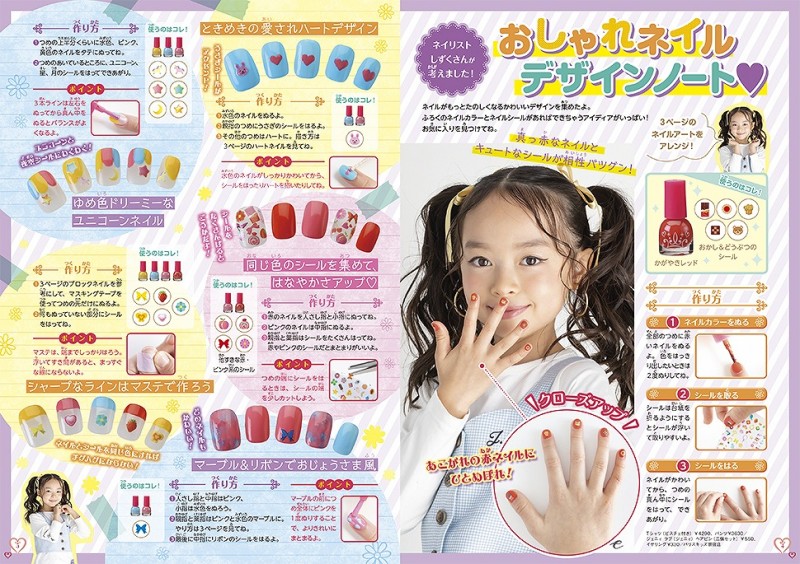 子ども用のはがしてオフできる水溶性ネイル4色(ピンク、赤、水色、黄色)と、ネイルで塗った爪の上に貼ってデコレーションできるネイルシールの付録つきムックです。誌面ではネイル遊びのハウツーと共に、プリンセスみたいな素敵な人になれるふるまいや身だしなみのポイントを紹介。ほんもののネイルで遊べる知育ムックです。
