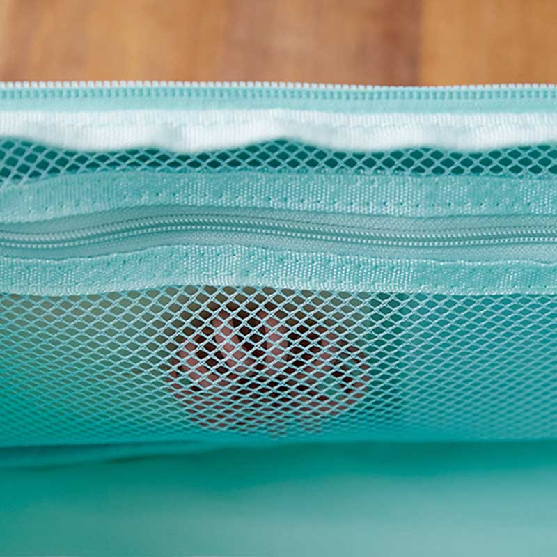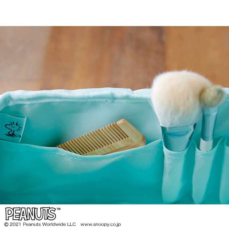 インテリアとしてちょこんと置くだけでもかわいいデザインで、収納力抜群なので、さまざまなシーンで使えます。ポーチの内側にはファスナー付きのメッシュポケットと、細長いものを立てて収納できるホルダーポケットが装着されているため、細かいものもすっきりと収納可能。また、奥行が約13.5cmとしっかりあり、倒れたり傾くことなく自立します。ランチバッグやおもちゃの収納など、アイディア次第で幅広く使える機能性抜群のマルチに使えるポーチです。