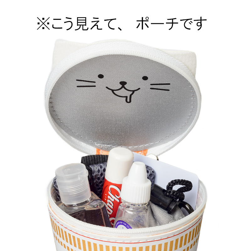 本誌限定アイテムは、カップヌードルの形&デザインそのままのほぼ実物大サイズのポーチ! 前から見ても、後ろから見ても、上から見ても、下から見ても、びっくりするほどそっくりな仕上がり。フタは今年リニューアルされた新形状“Wタブ”仕様。シルバーのフタの裏にはネコをプリントし、話題の“ネコ耳”まで再現しました。裏地には、本誌オリジナルデザインの麺&具材柄をプリント。ファスナートップがストラップになっているのもポイント。そこにあるだけでワクワクするポーチを、ぜひ手に入れて!